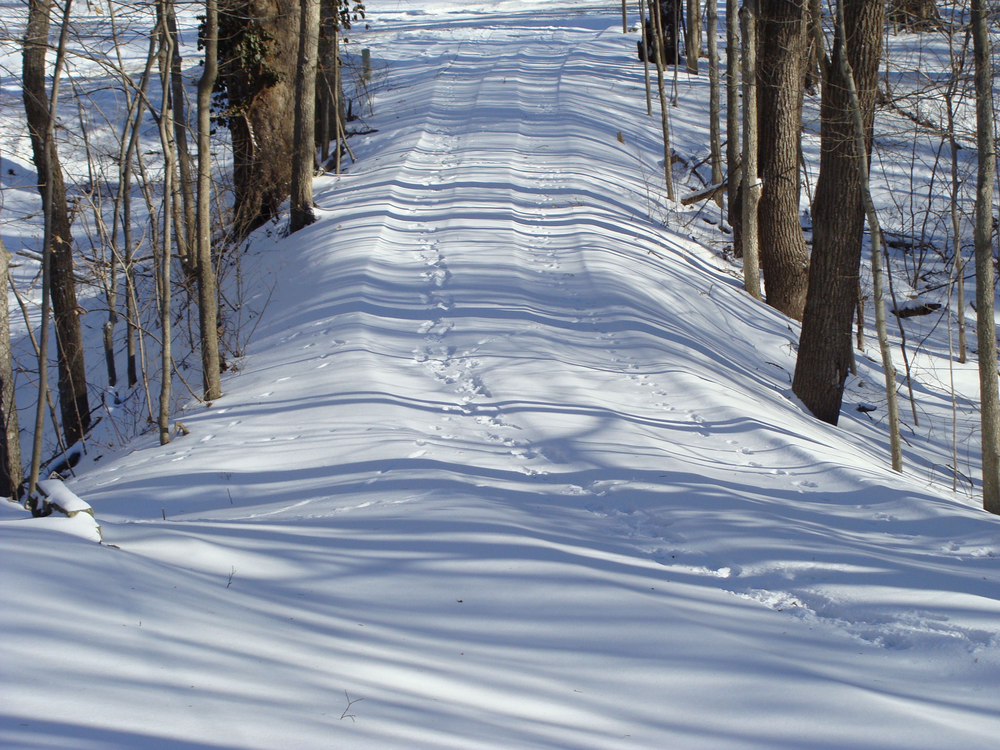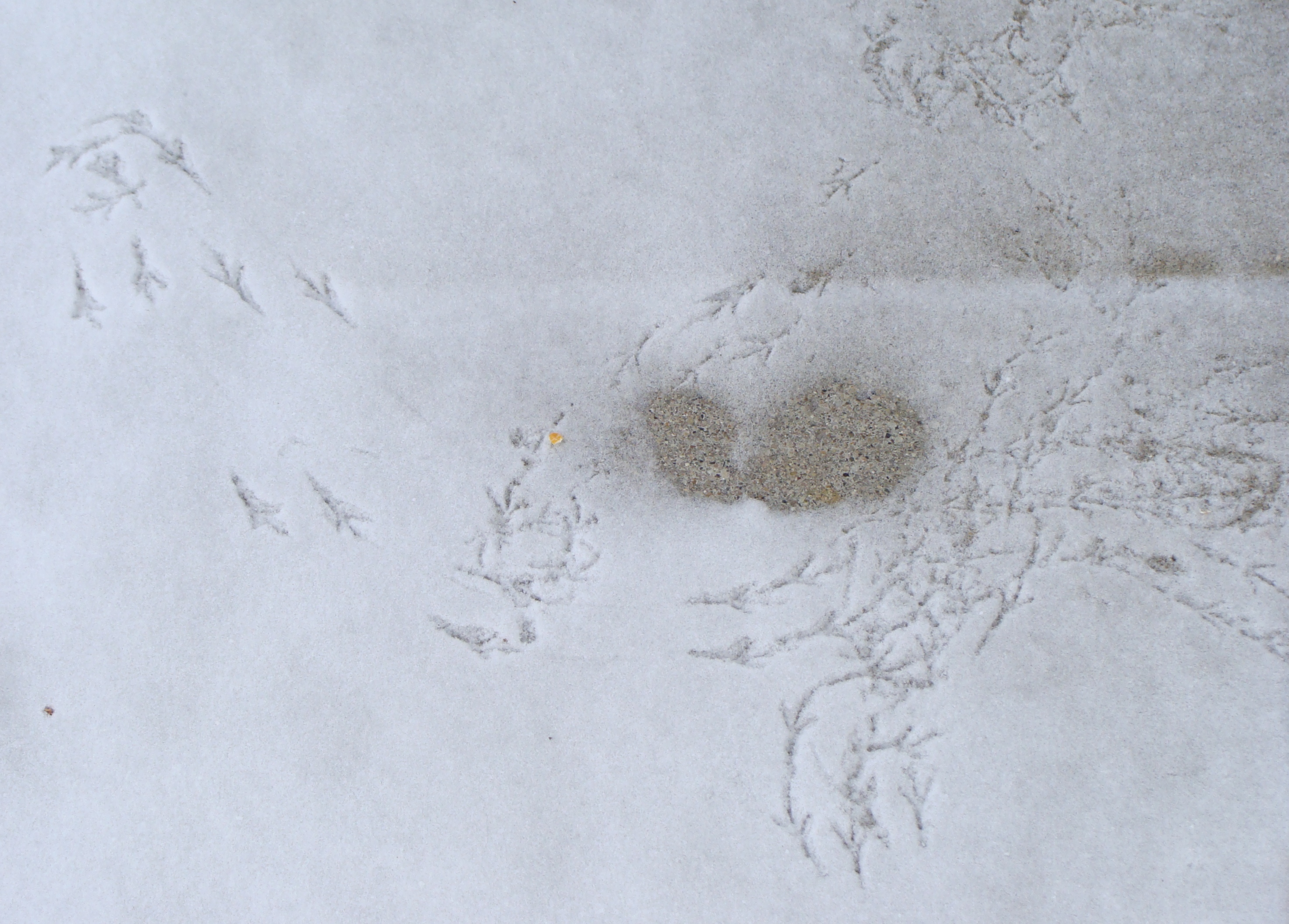 Dog tracks, deer tracks and human tracks show off the fresh snow on the driveway.