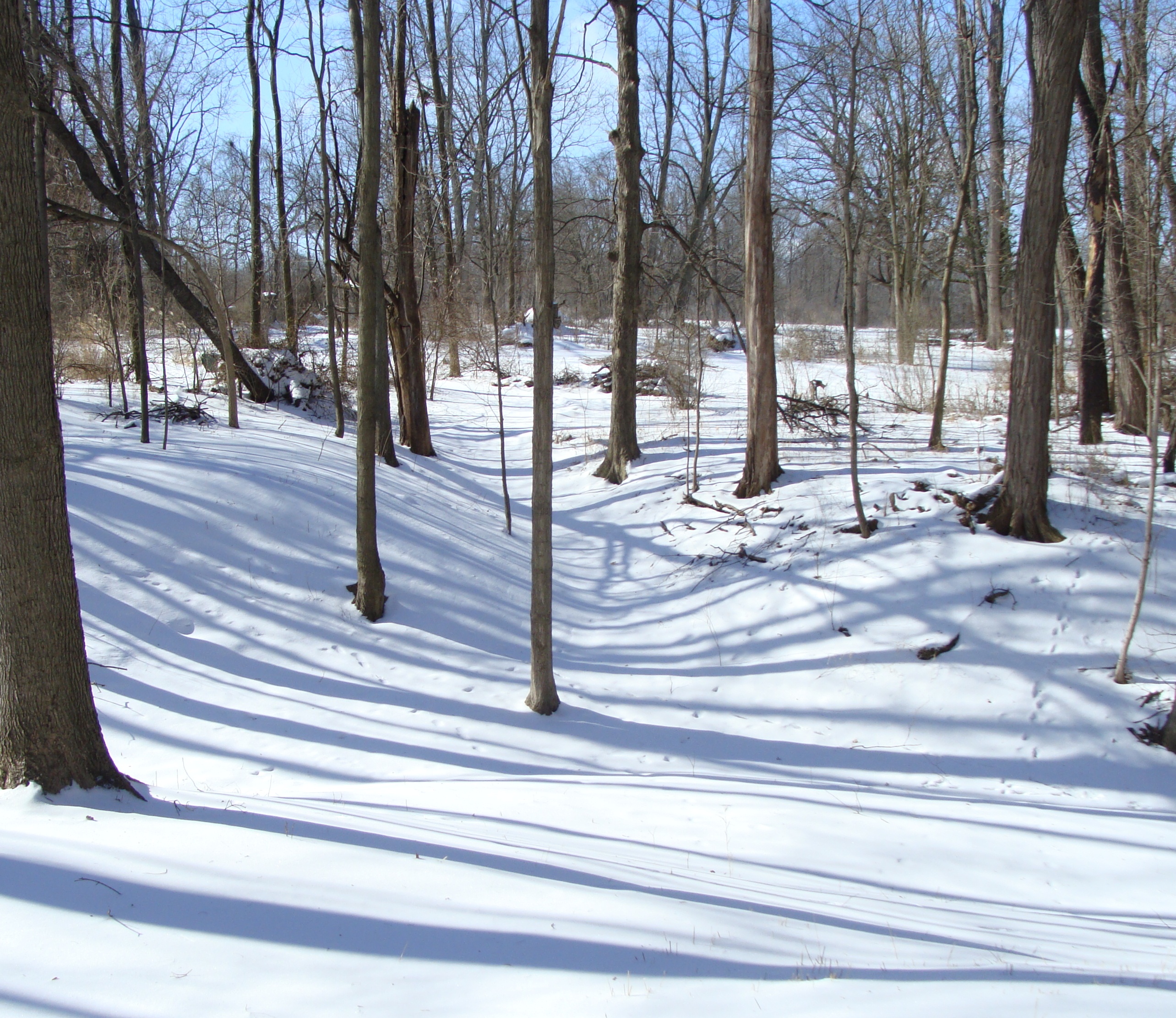 This effect is particularly notable in the front valley where the shadows cross the small, frozen creek.