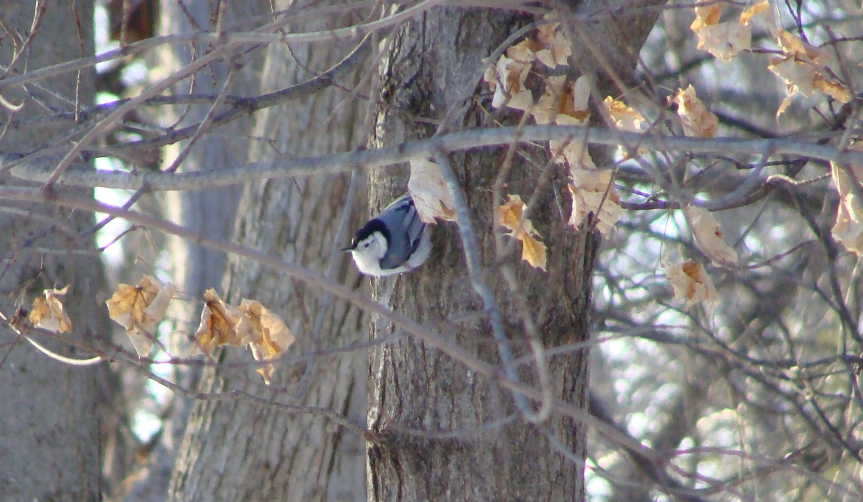 And the good ol’ white breasted nuthatch came around too. The nuthatch was a regular here while the big poplar tree was still vertical, walking up, down, sideways and all around as only the nuthatch can do. Alas, the tree had to go down. It lies across the valley now and the nuthatch is seldom seen.