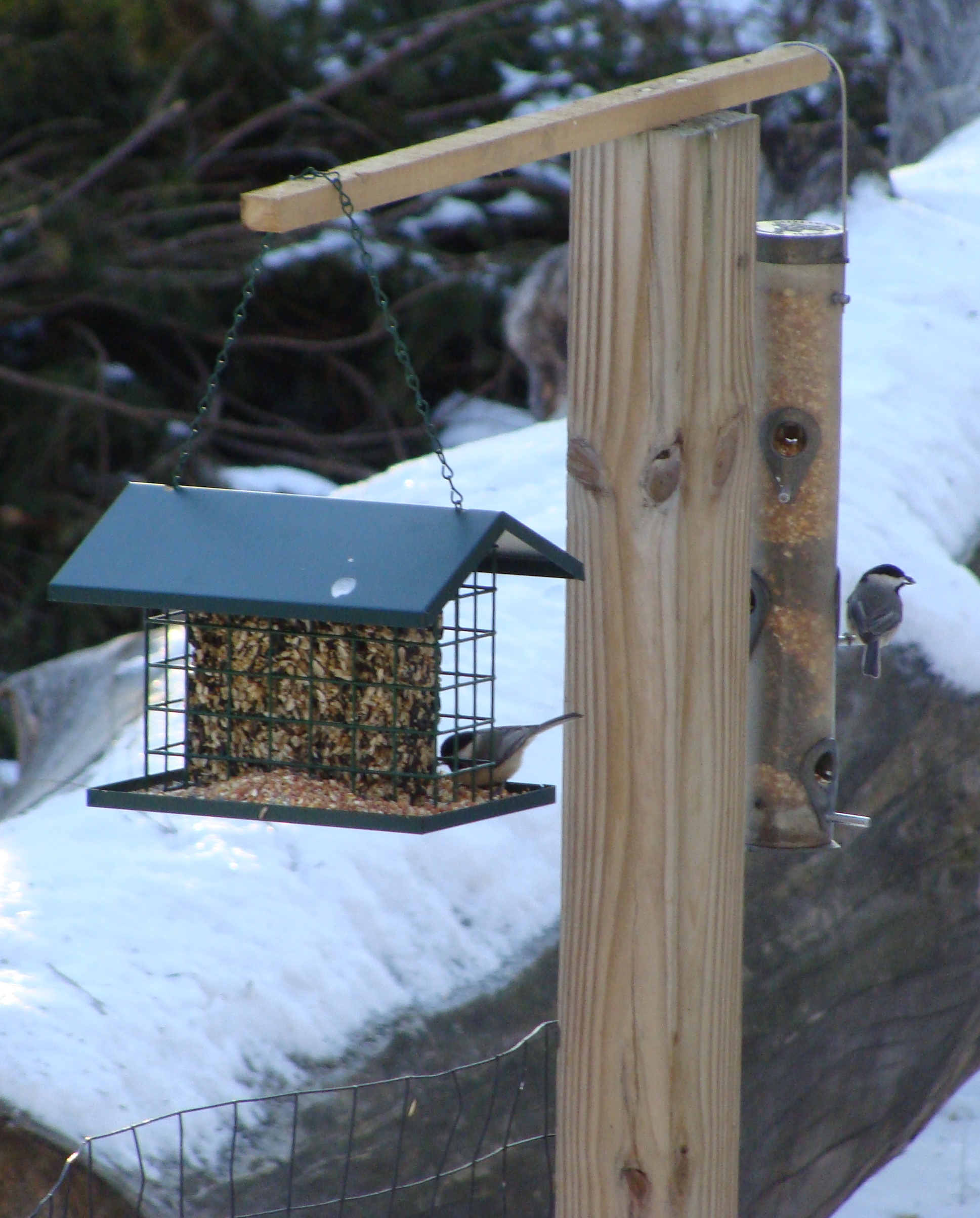 Over at the feeders a pair of chickadees nibble on their dinner.