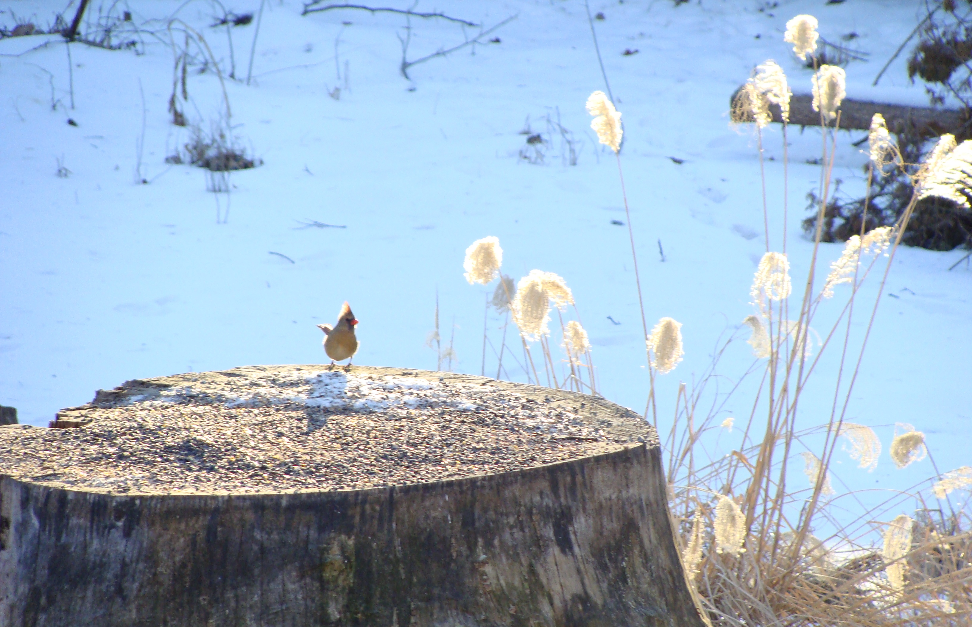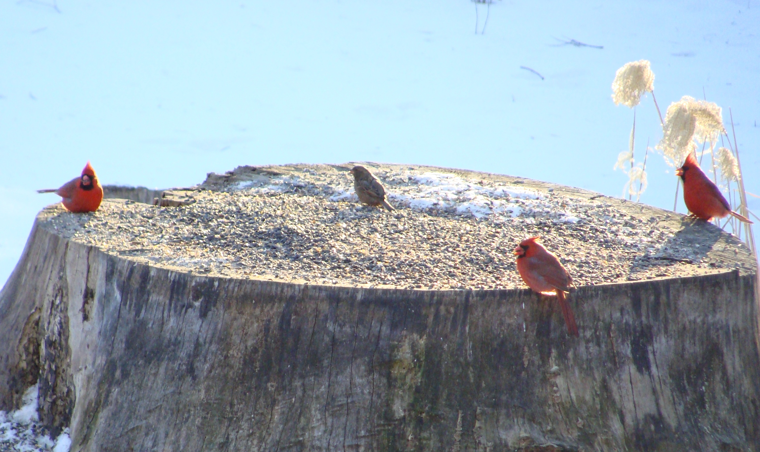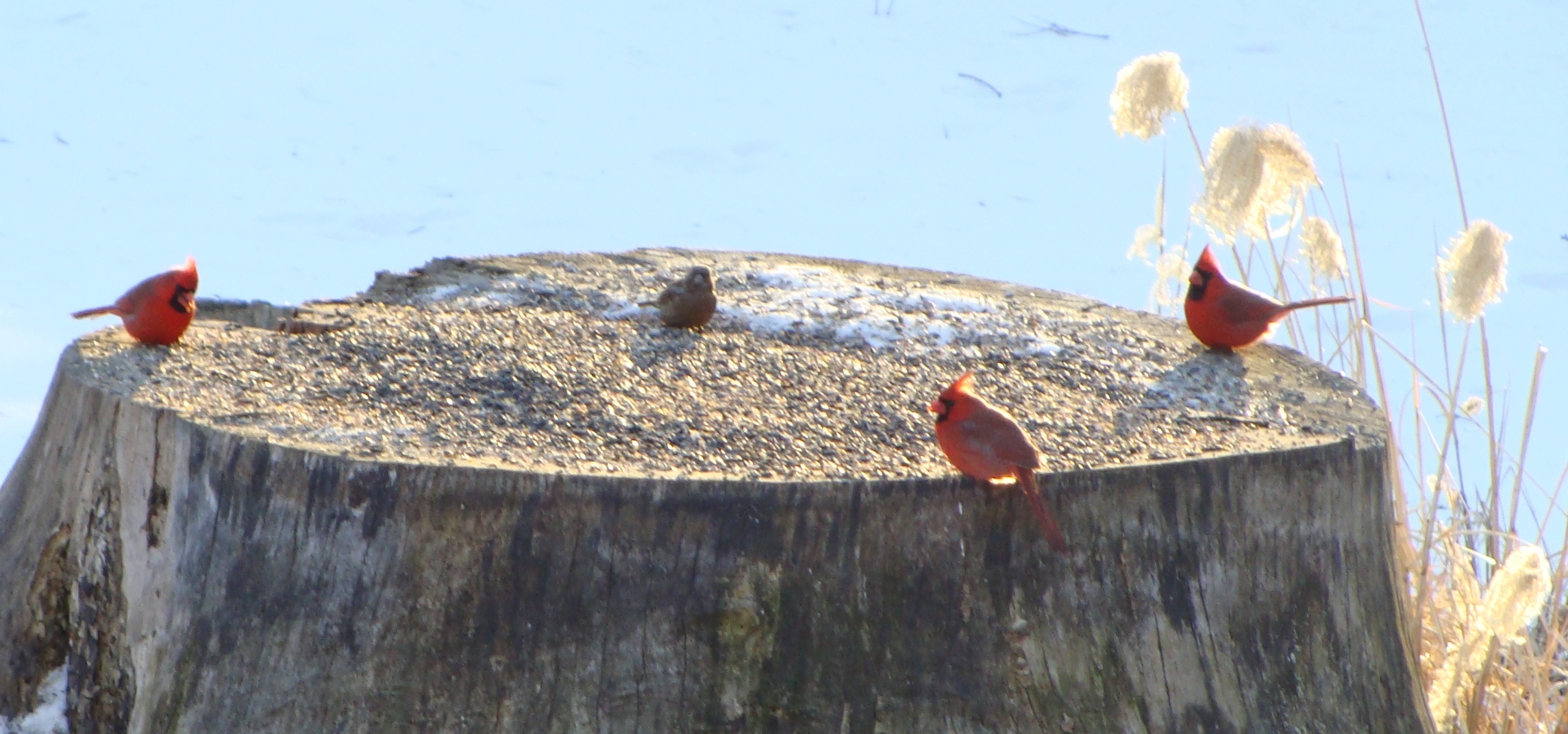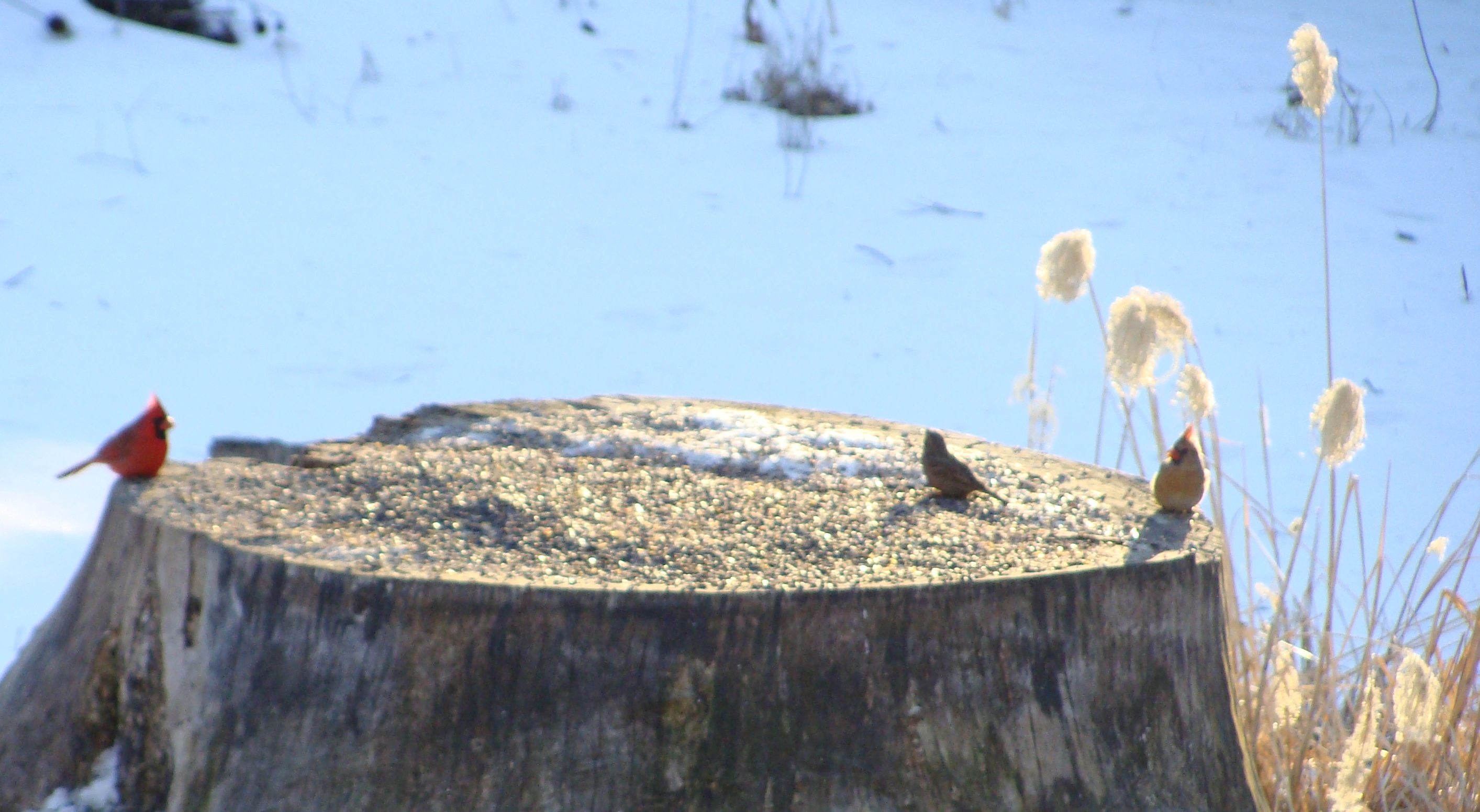 She and her mate seize the chance to enjoy a peaceful date. No sparrows, no juncos. The stump all to themselves!