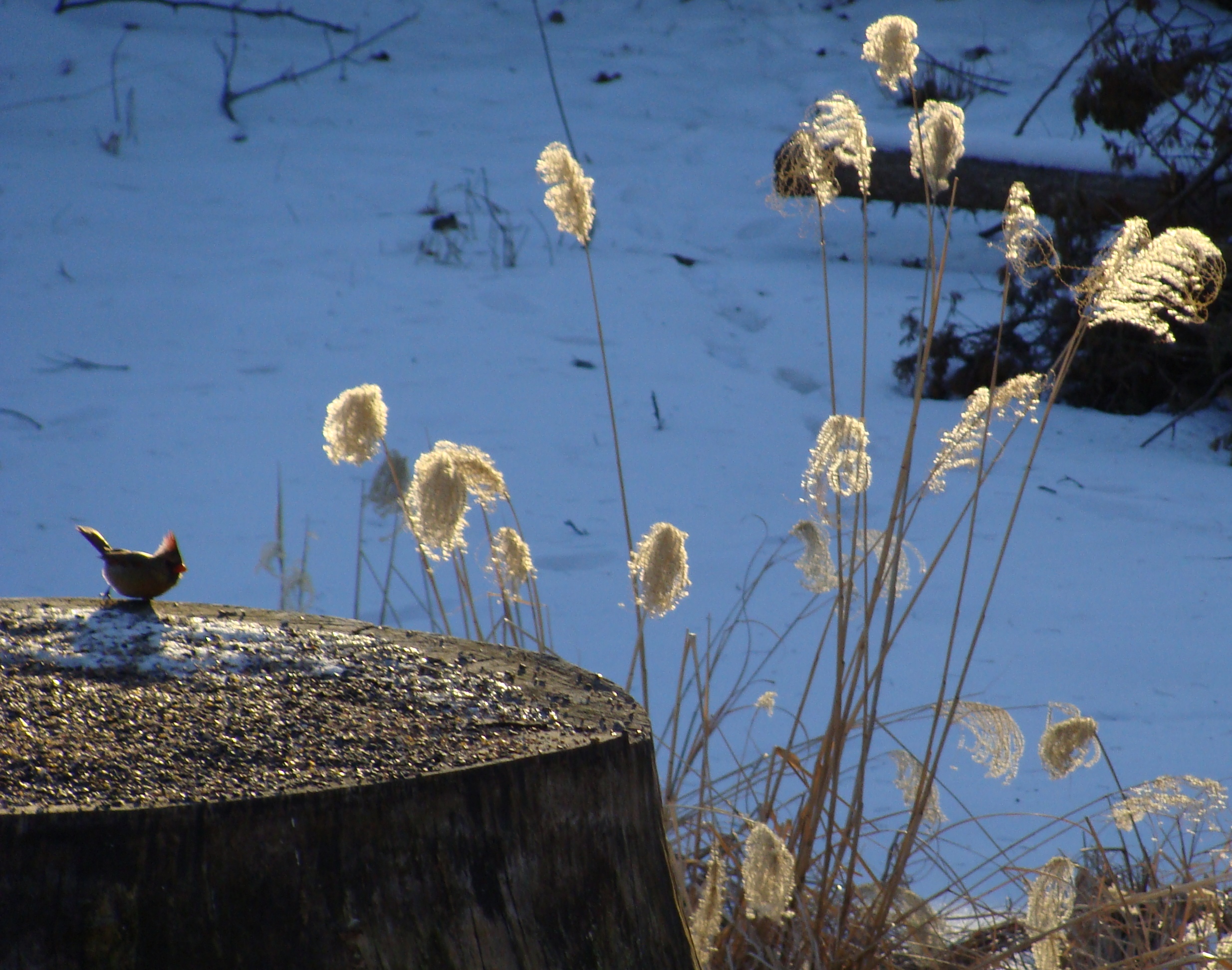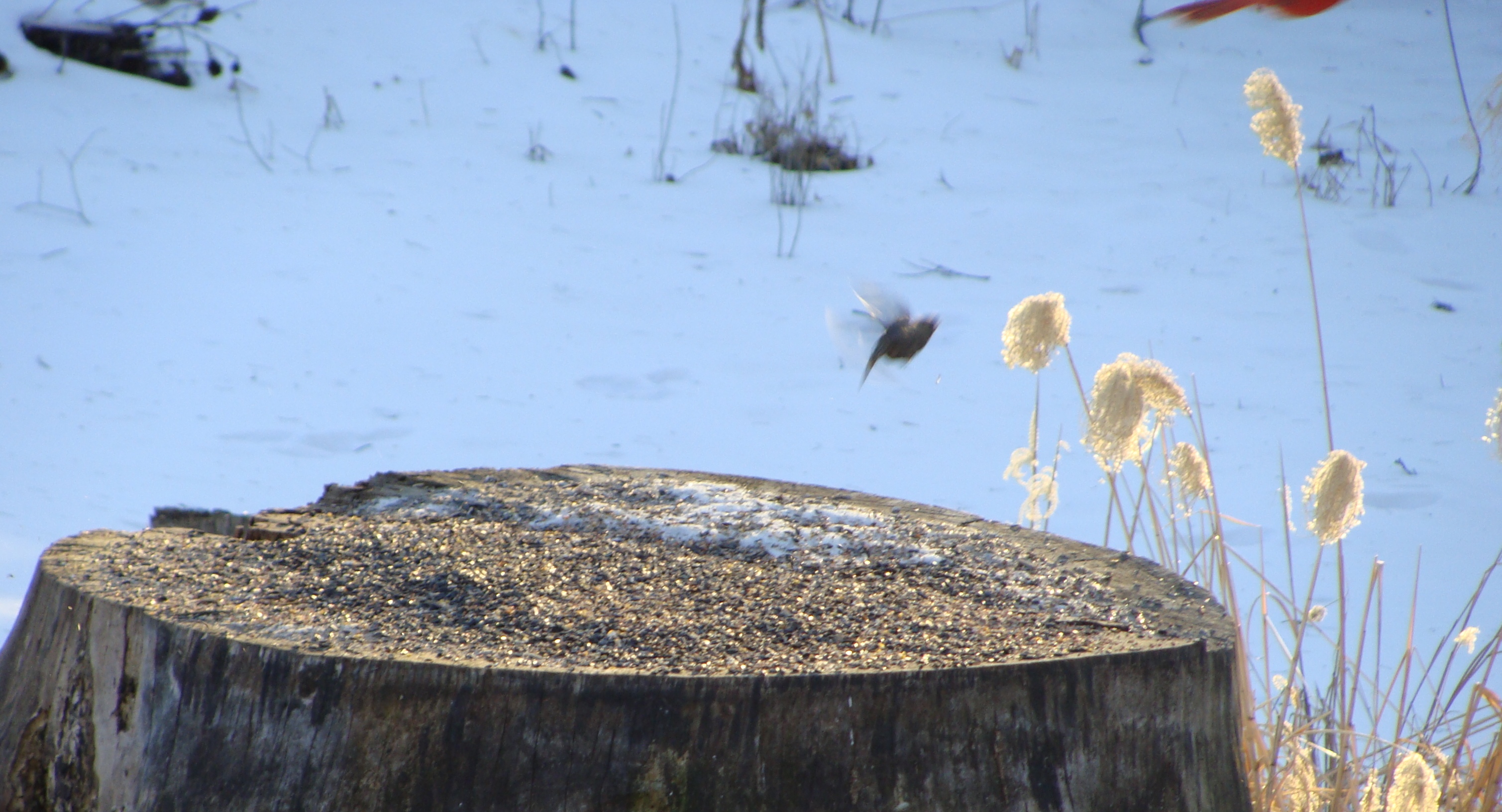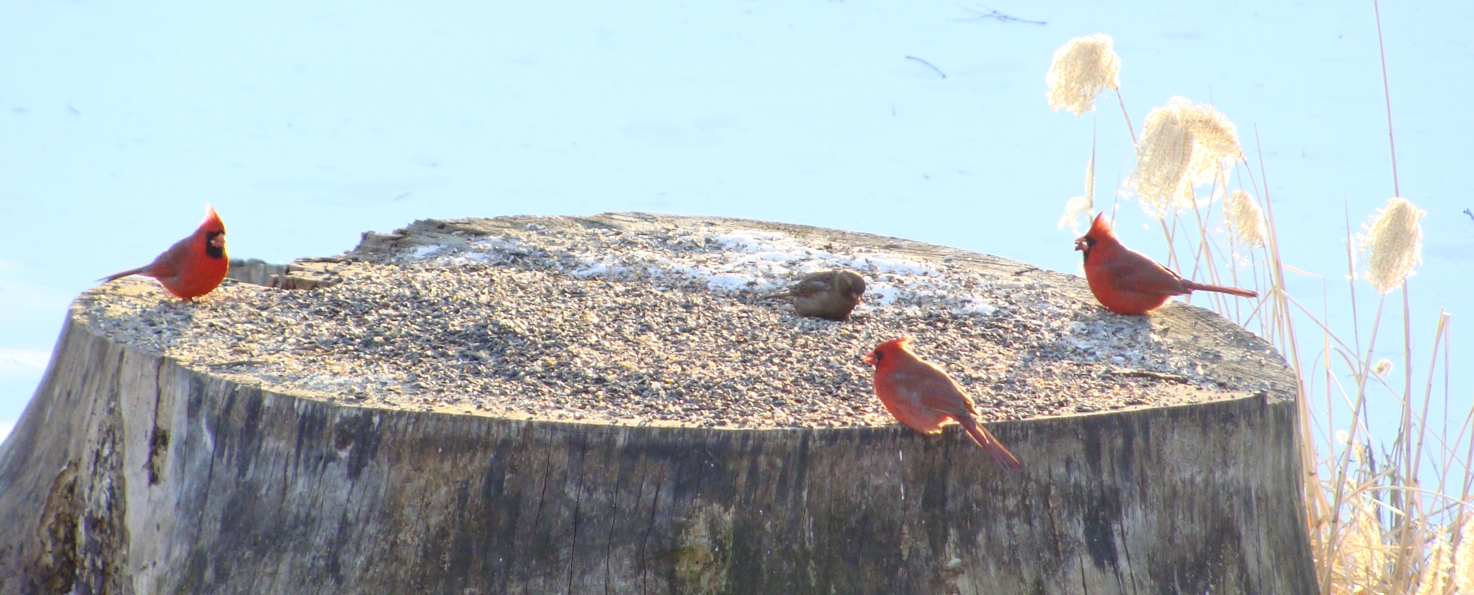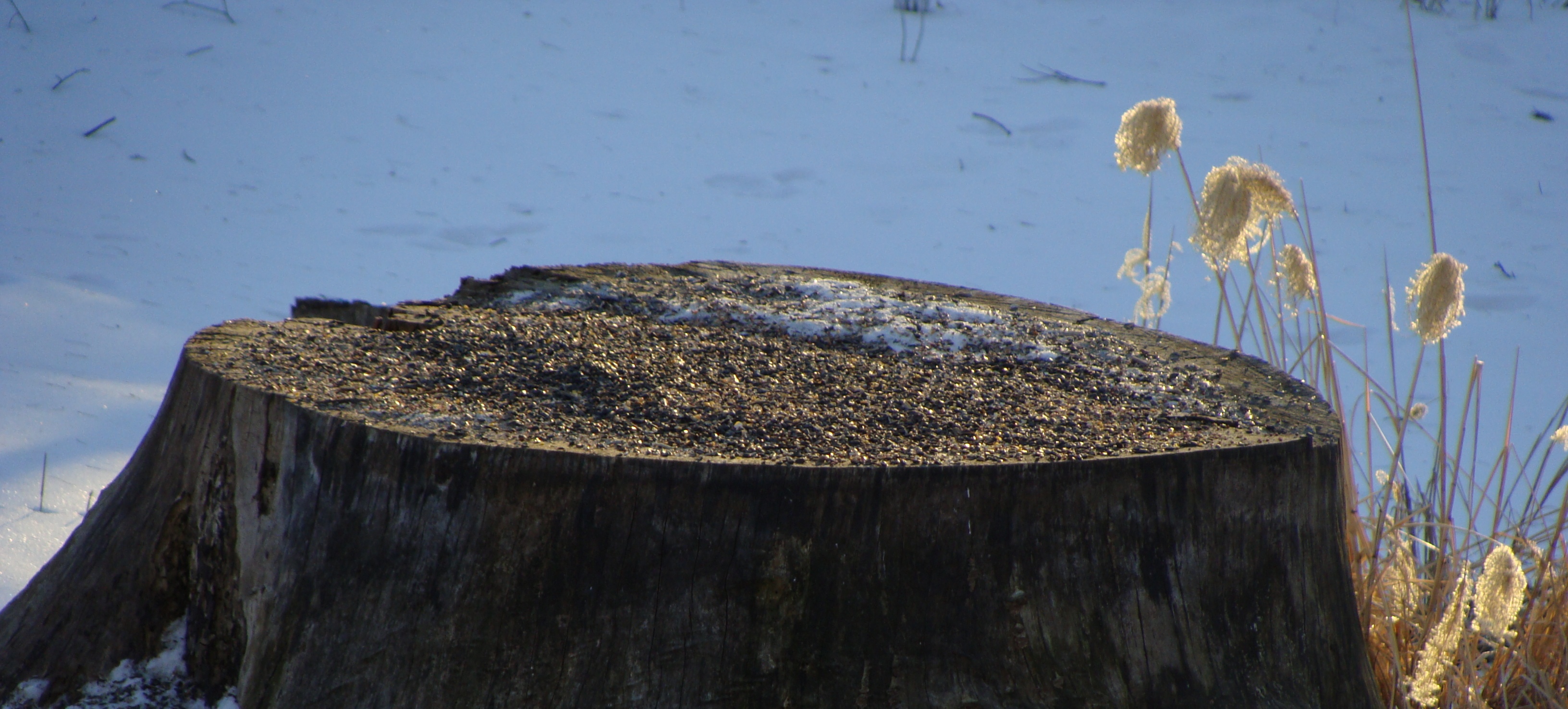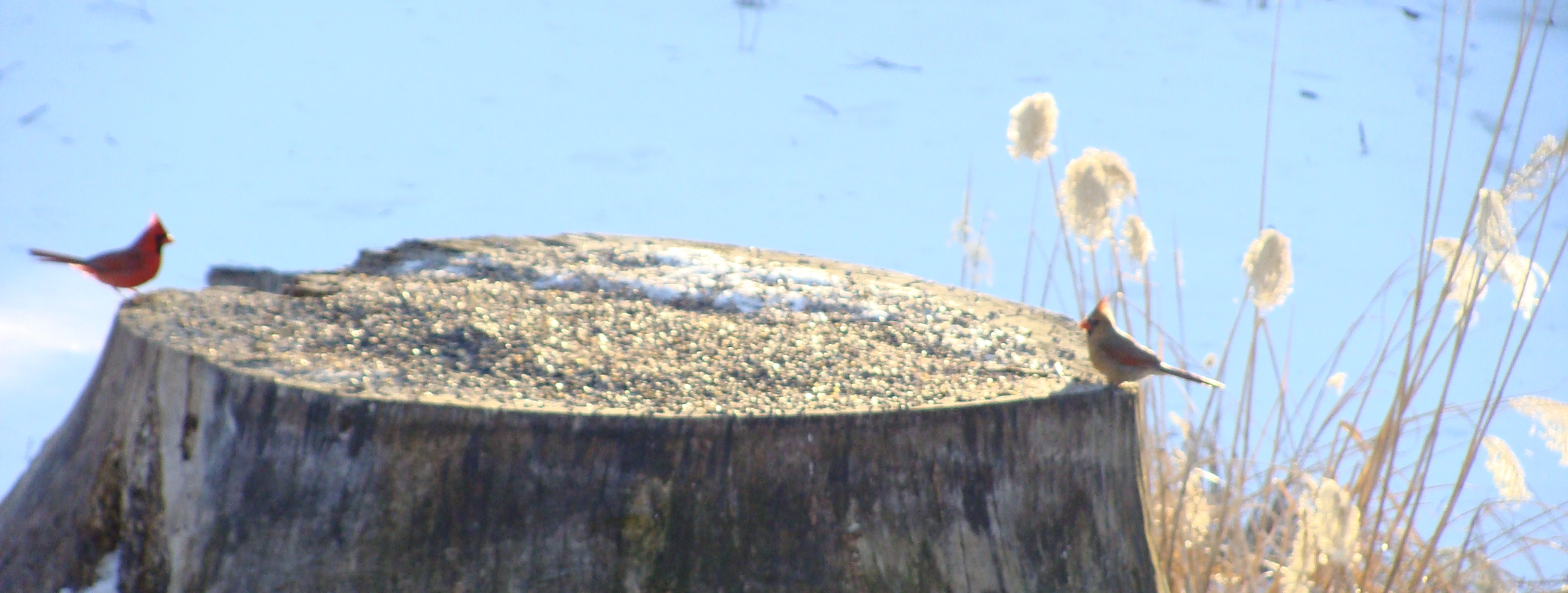 She and her mate seize the chance to enjoy a peaceful date. No sparrows, no juncos. The stump all to themselves!