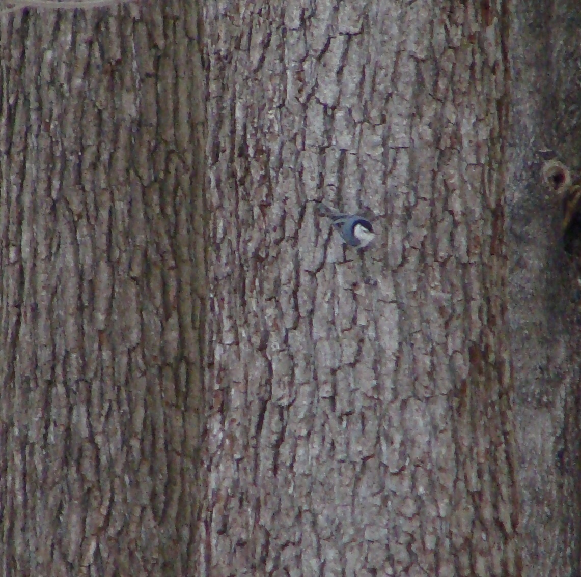 Let’s take a closer look. Please pardon the fuzzy pictures of the bird in the next few slides, but they are worth a peek, showing a limited example of the bird’s movements. The nuthatch is the only bird in this garden who has ever been observed to walk up the trunk of a tree, turn around and walk back down it. Up, down, sideways, the nuthatch walks where it pleases. Woodpeckers stand against the tree vertically and hop from position to position. Clunky. The rest of the birds seem limited to flight and walking on the ground or across branches. The nuthatch is free and versatile. Up, down and around.