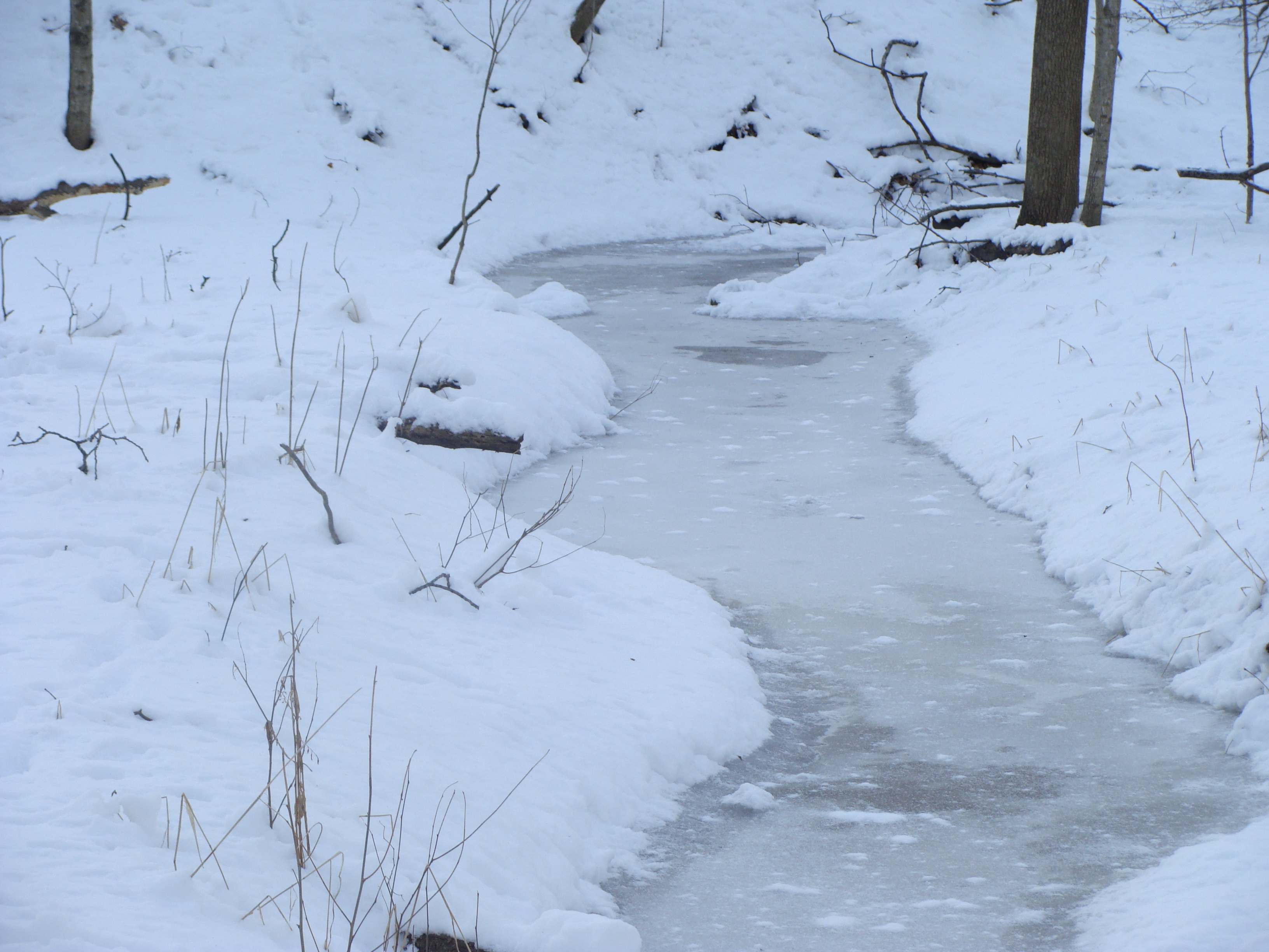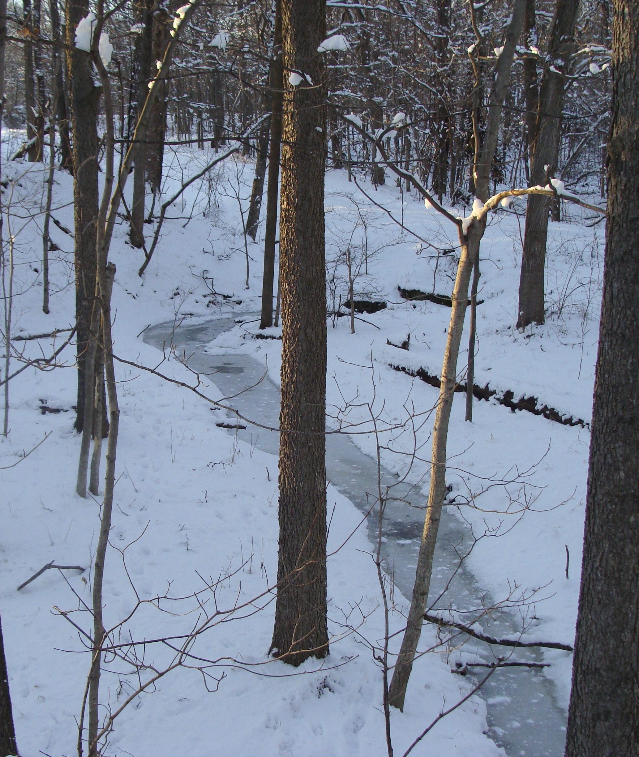 Moving on to Monday evening. The little creek is usually a dry bed, running water only after rain. It freezes only when a substantial rainfall yields to immediate cold. That condition occurred Saturday into Sunday and voila! The creek is full and frozen: