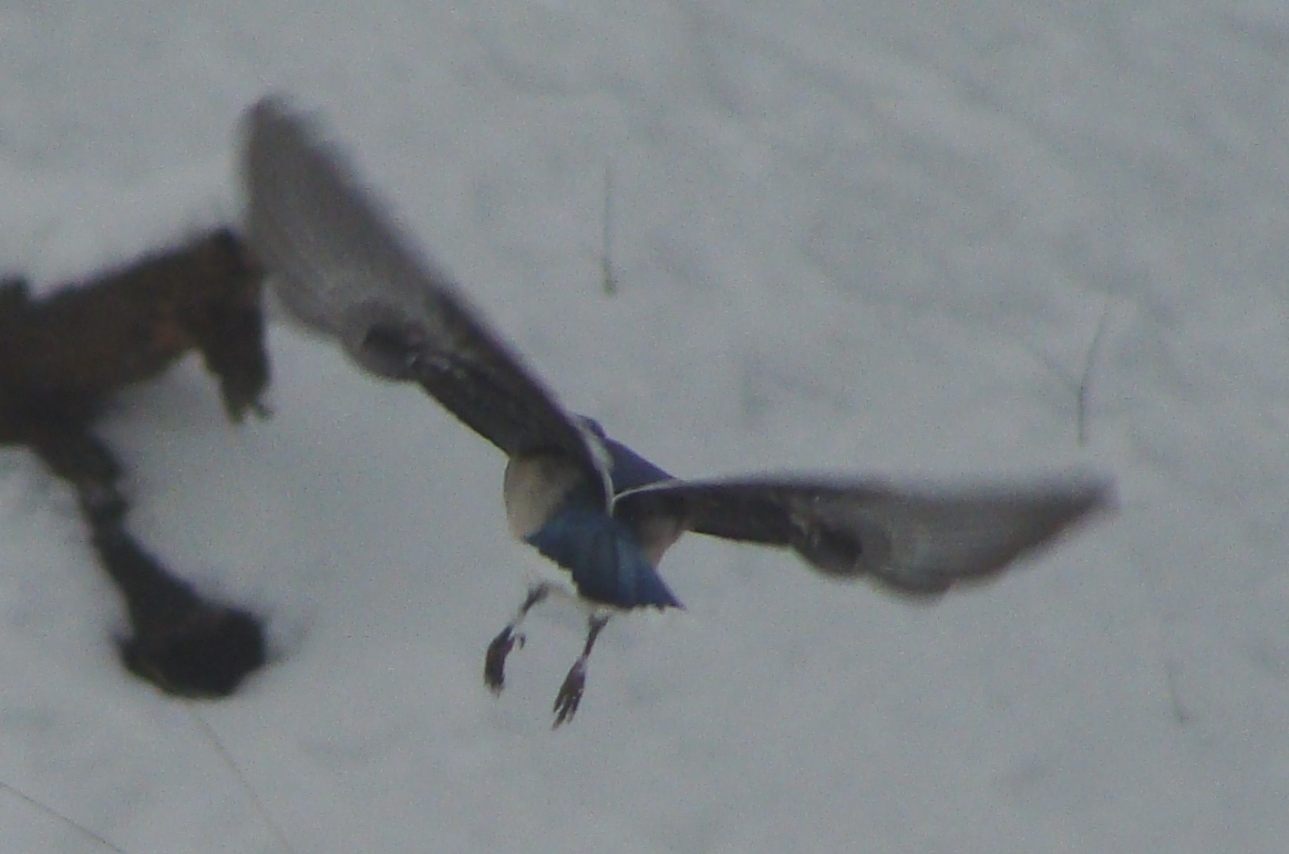 It is a blue jay flying away from the camera. Here is the same bird about 5 seconds earlier.