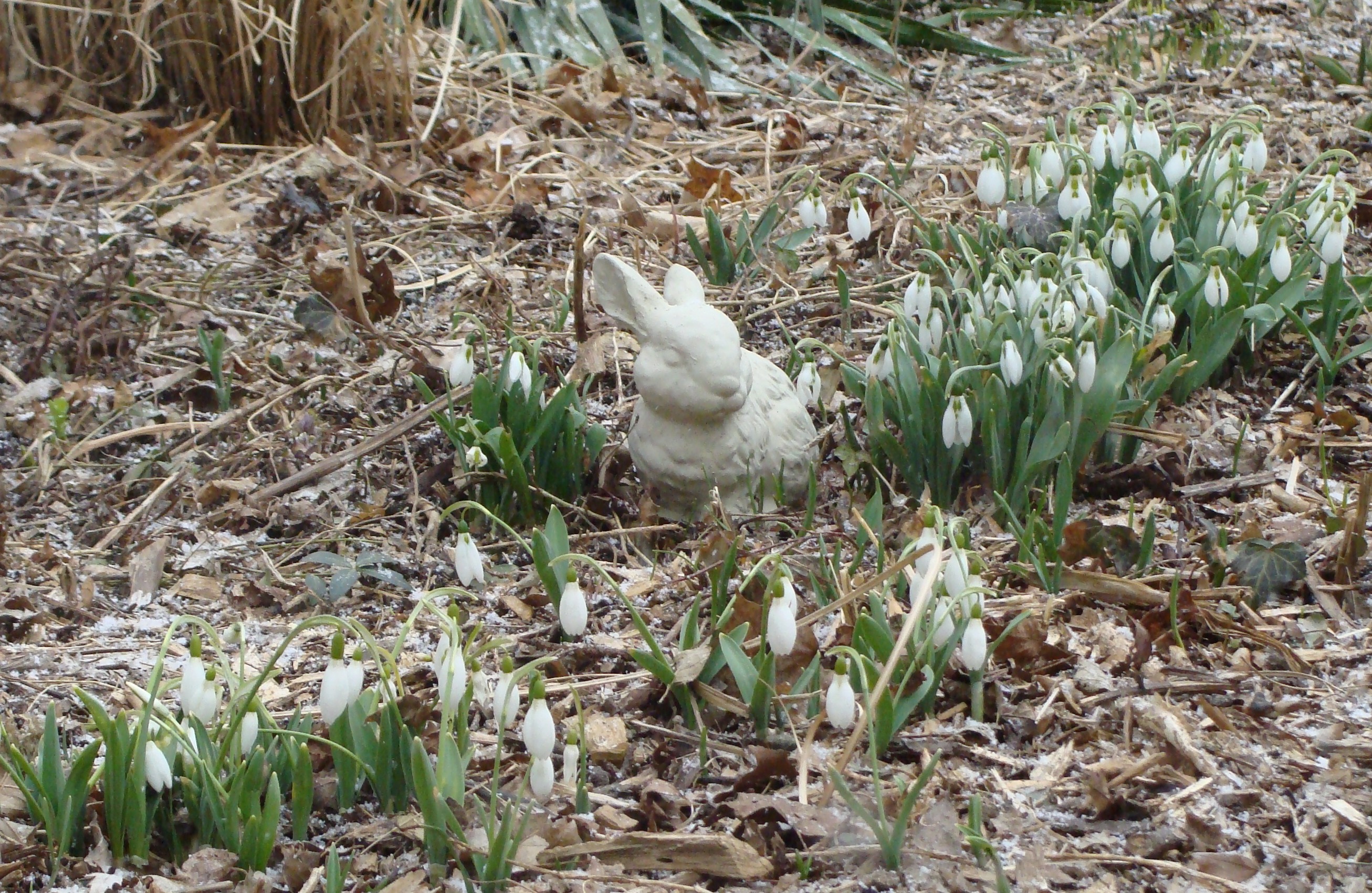 Stone Bunny says, “Well, if its going to snow, I would like to be with the snowdrops.”