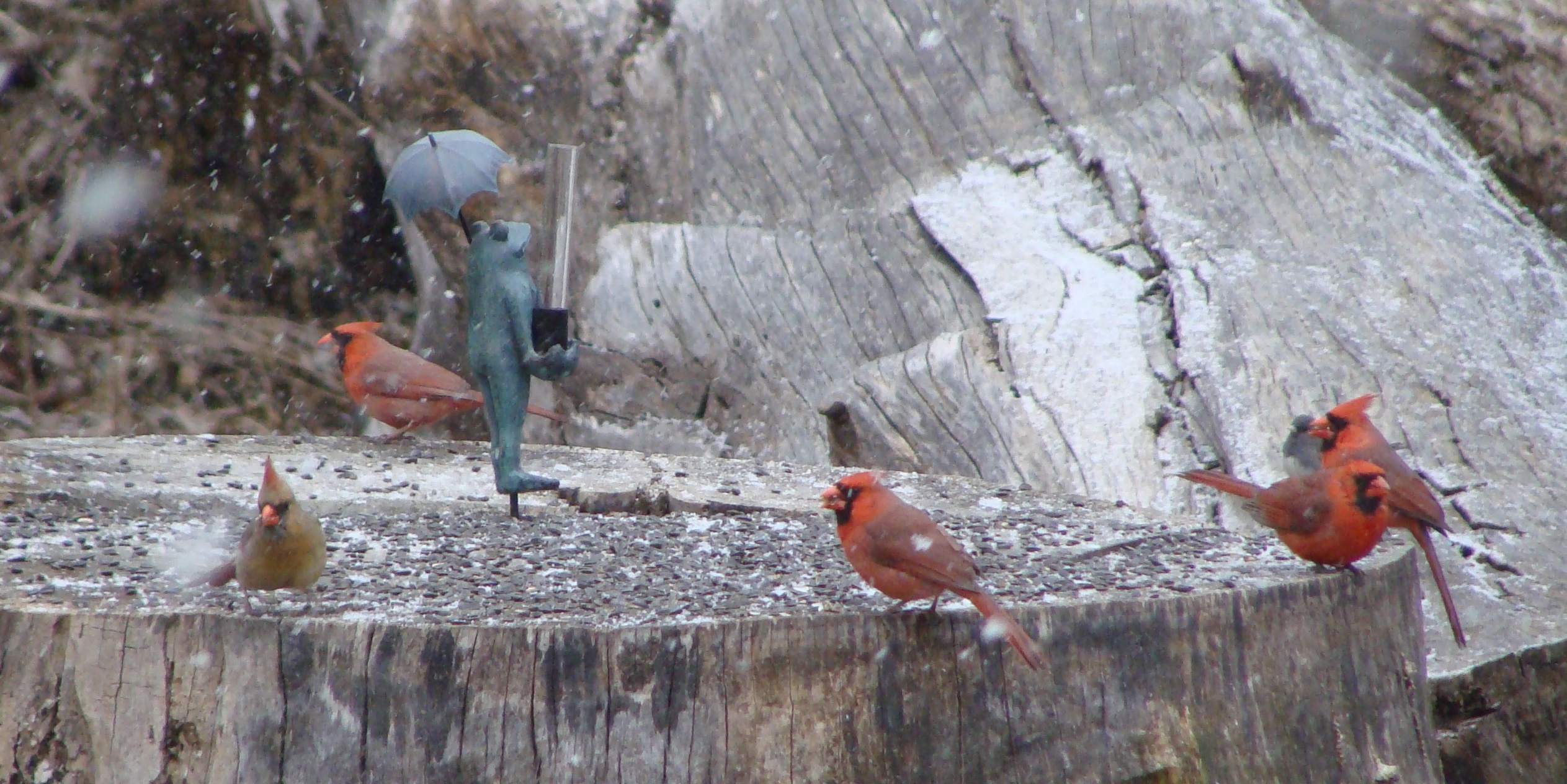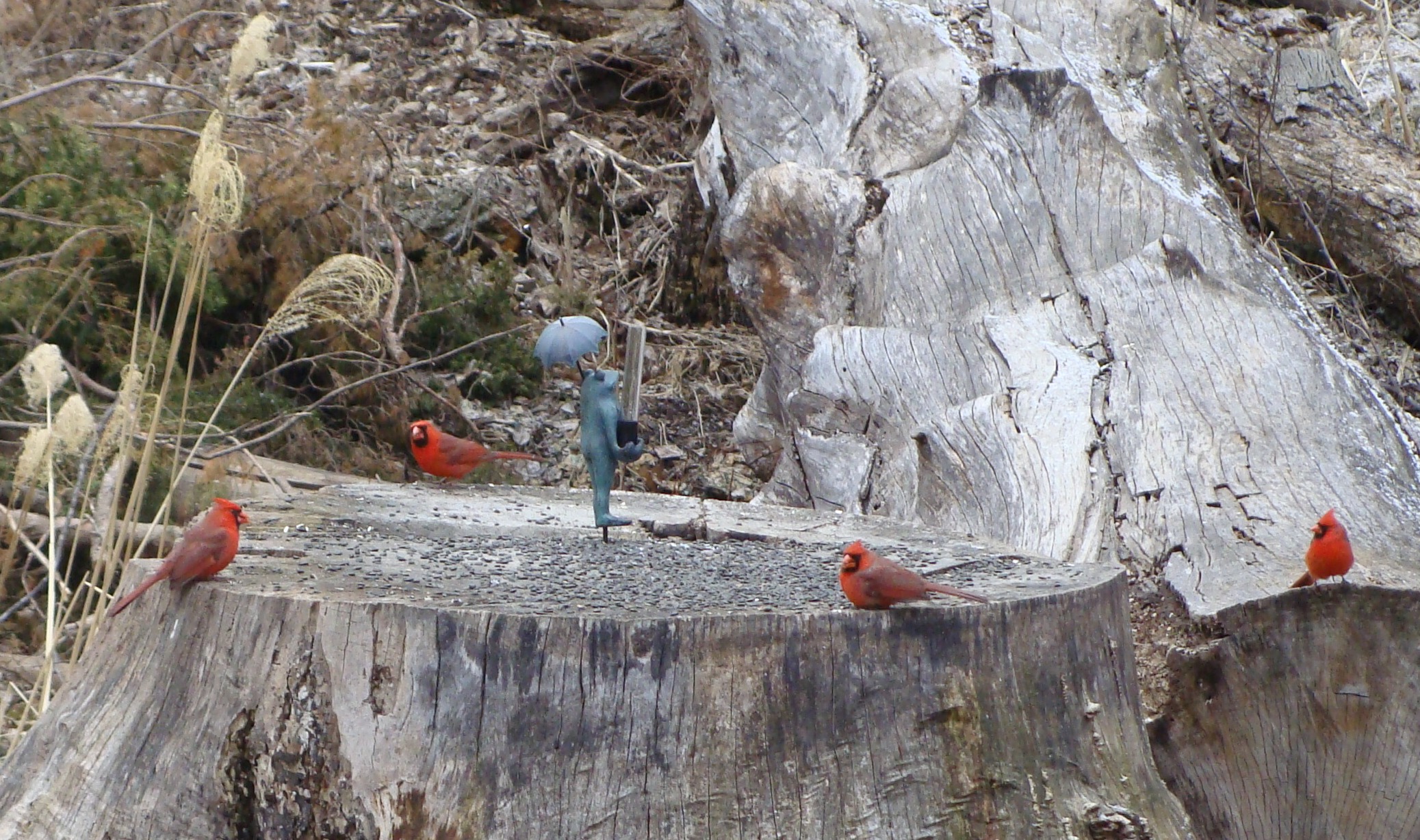 Over at the stump the cardinals show some good bird sense. They haven’t detected enough honest spring weather to vacate the easy feeding grounds.