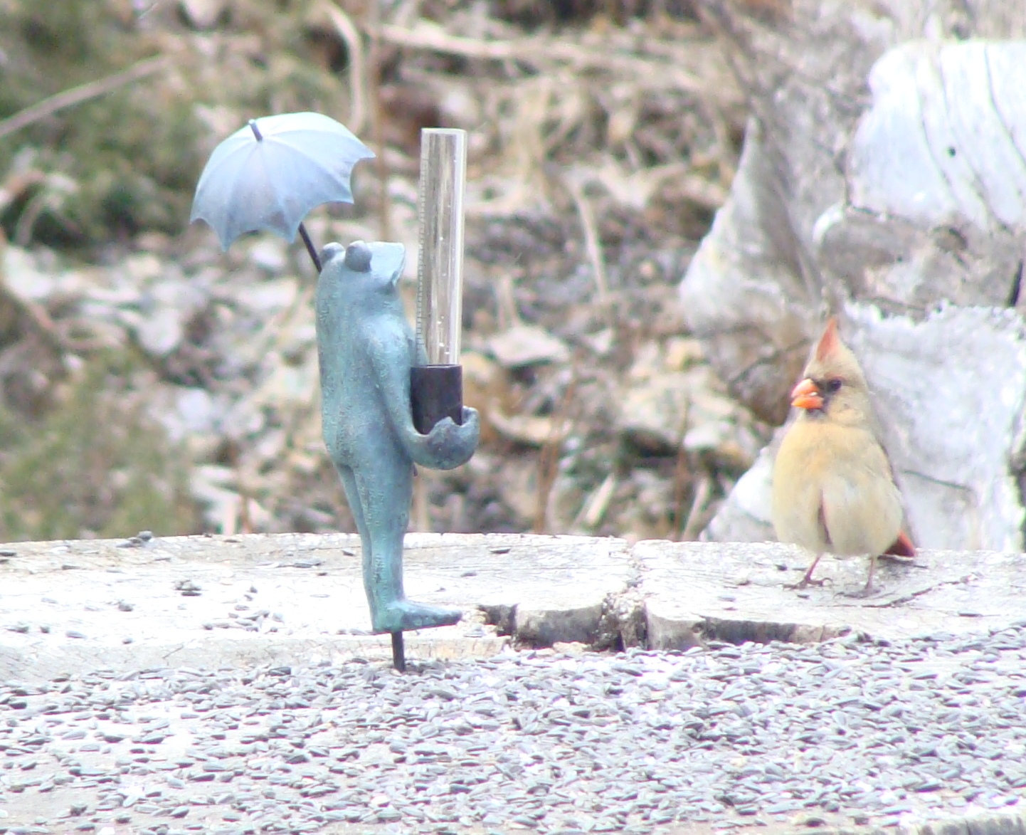 Brass Frog would like to know who had the bright idea to put him on the stump. Oh, he understands that it is an excellent place for a rain gauge (which he is) but he is quite wary of all these darn birds.