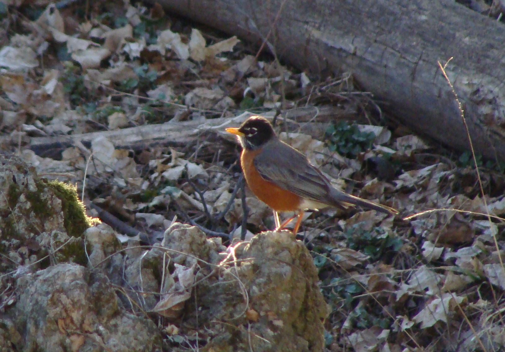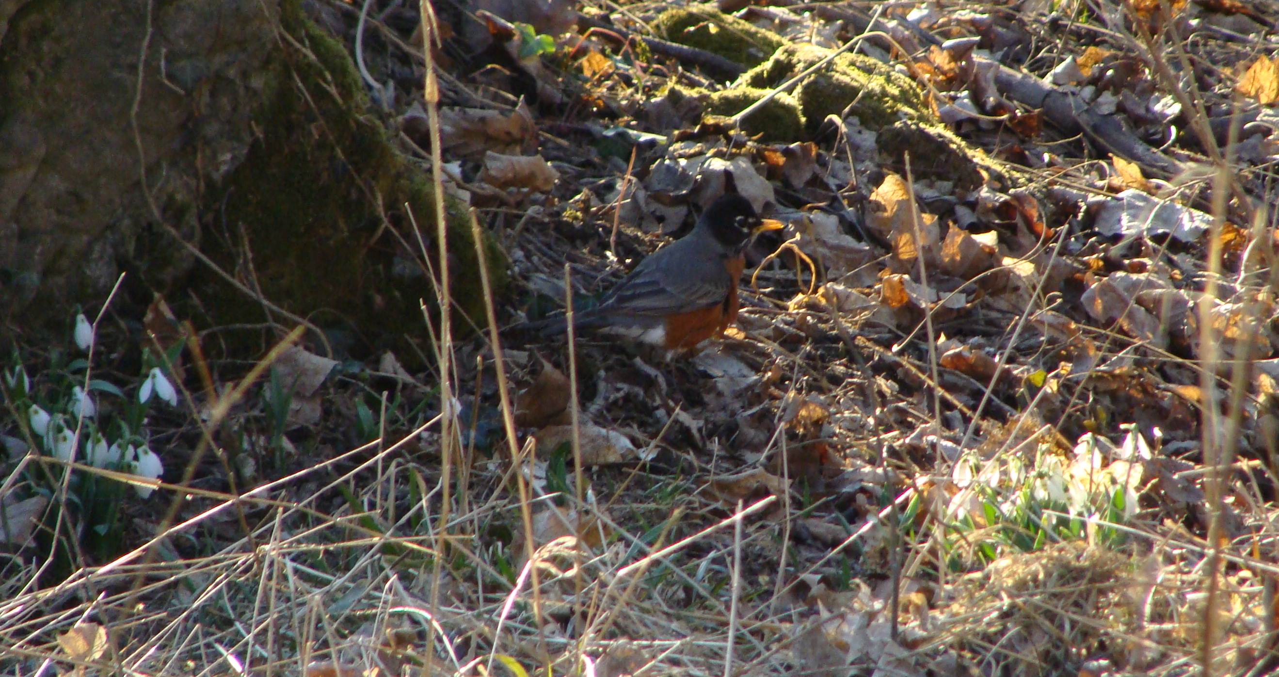 In a fine display of the transition from “later winter” to “early spring” the robin forages amidst snowdrops in the valley.