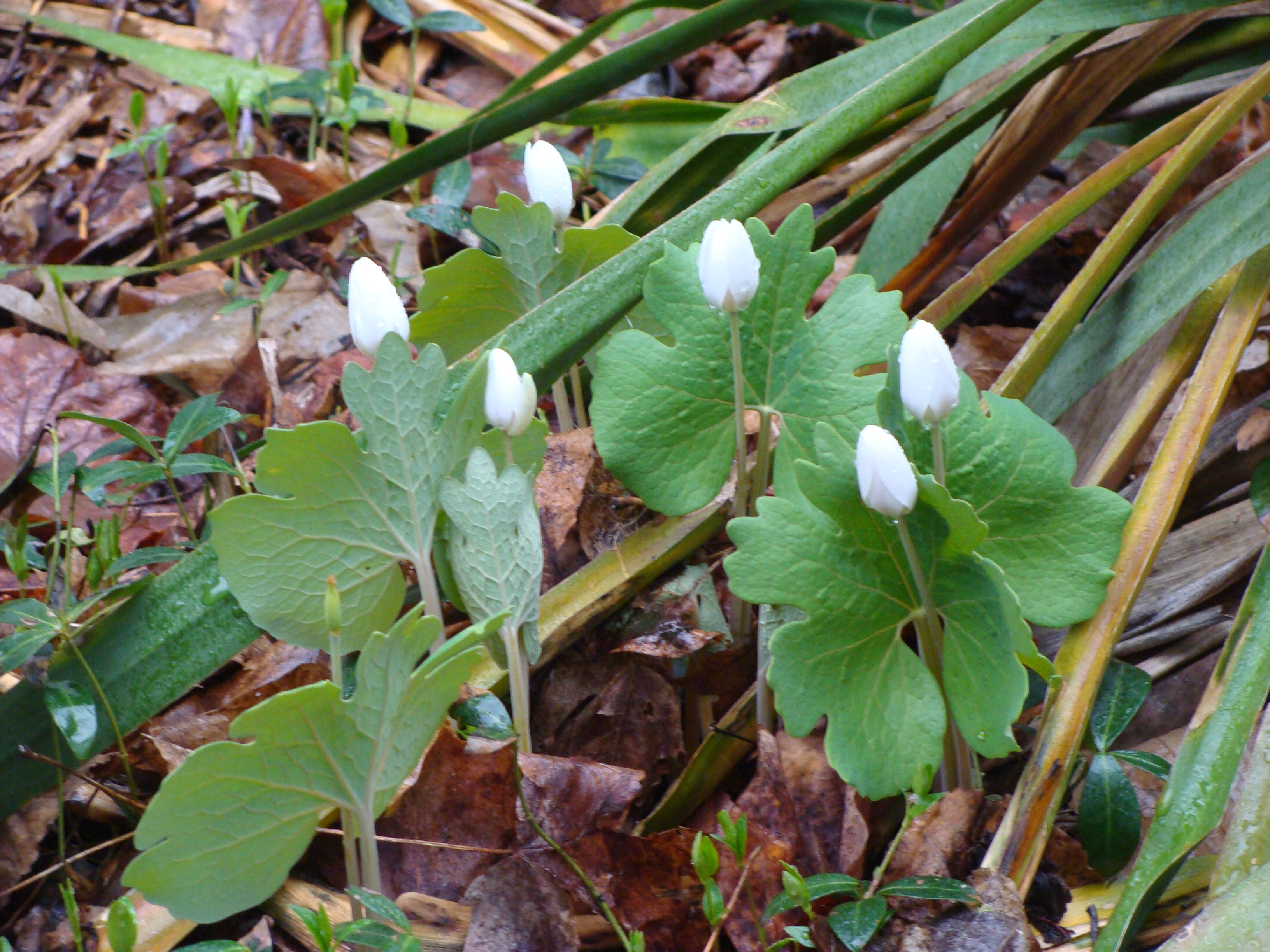 Bloodroot, typically a forest dweller, blooms in the gardens amidst the pokey leaves of the Yucca plant.