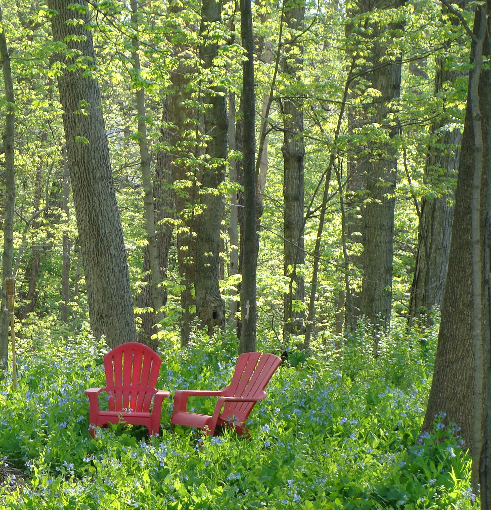 J’aime beaucoup les deux chaises rouges ensevelies au milieu des fleurs bleues, on a envie de s’y installer et de profiter du chant des oiseaux et de la brise légère.