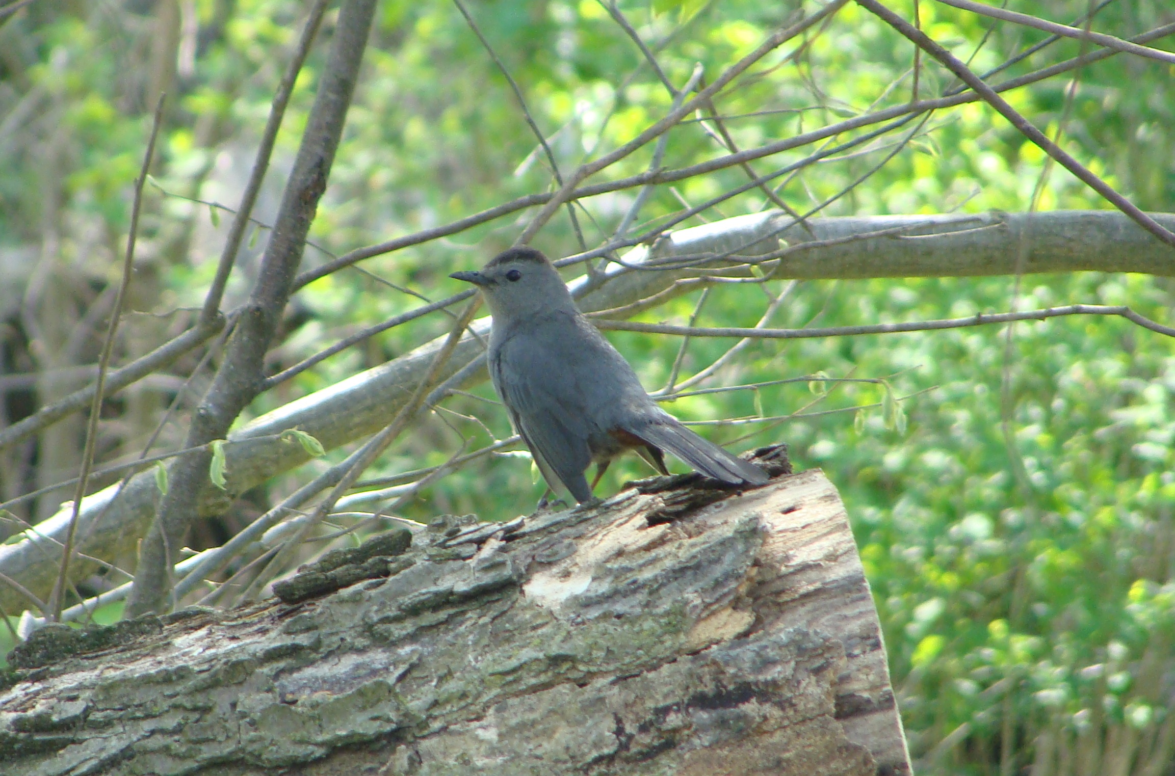 Over by the apple tree, amongst some recent wood cutting work, a lone catbird checks in.