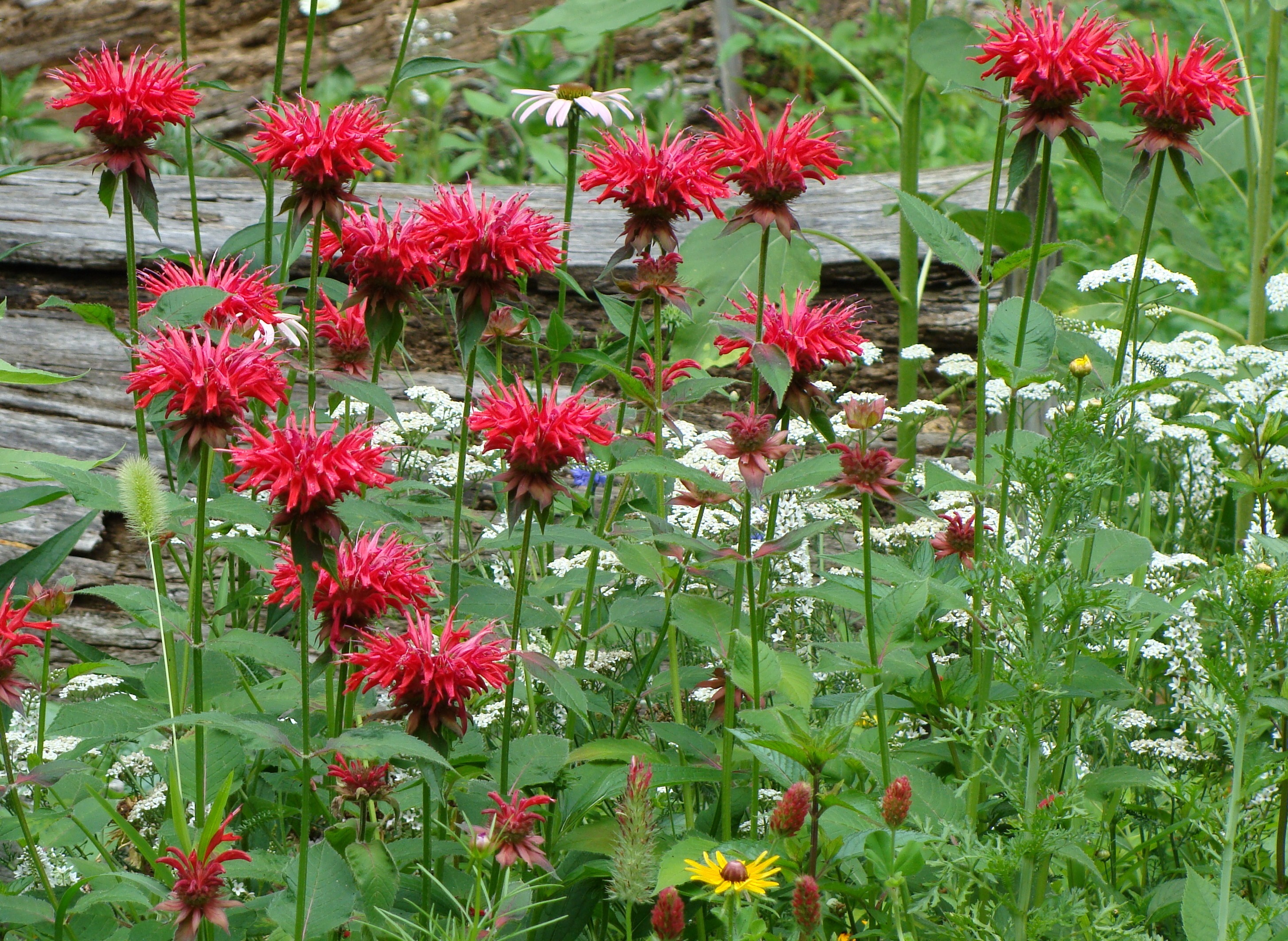 Brass Frog was pretty darn pleased with himself when he observed the nice combo of white yarrow growing with the red bee balm down in the stump garden.