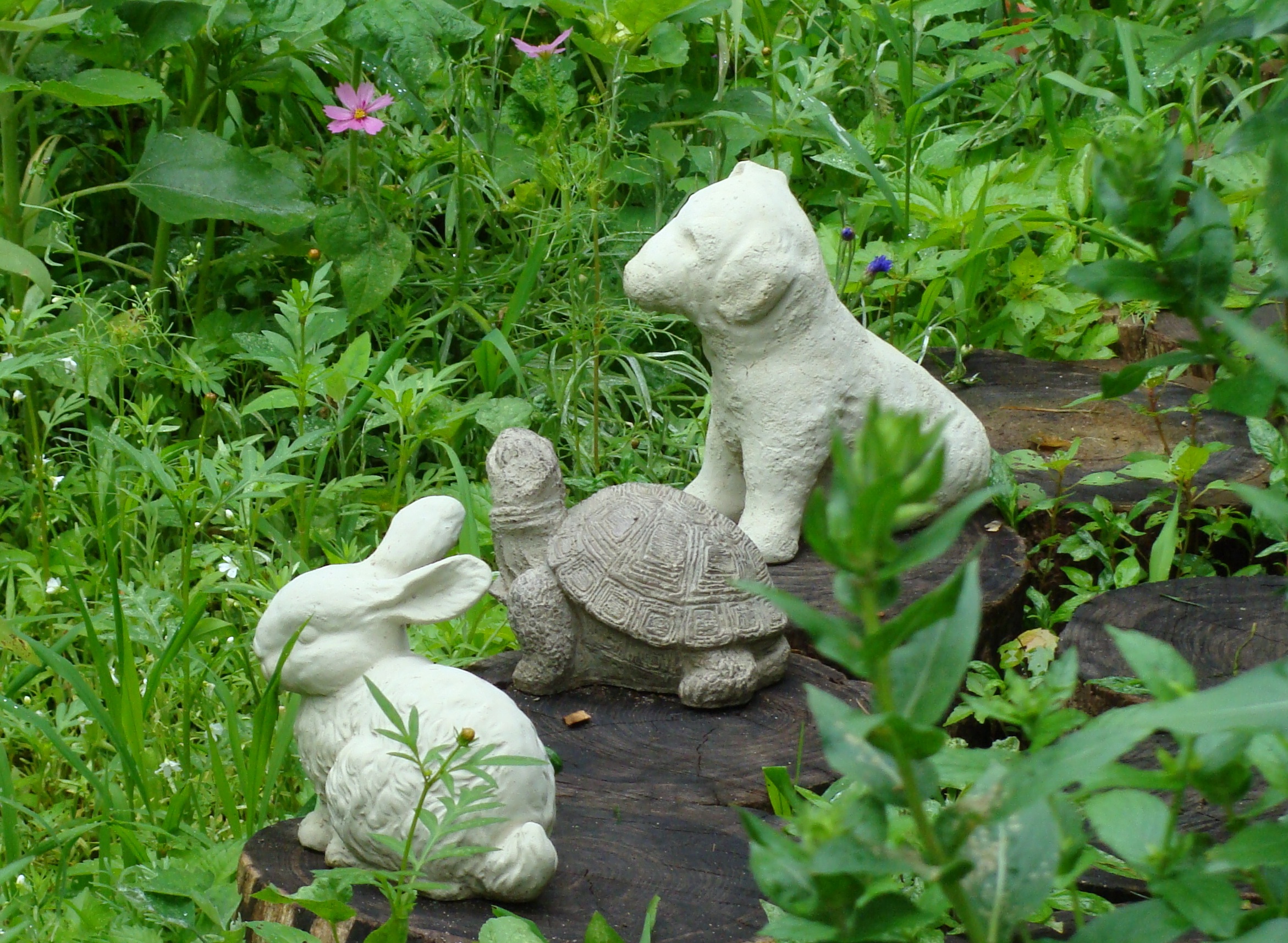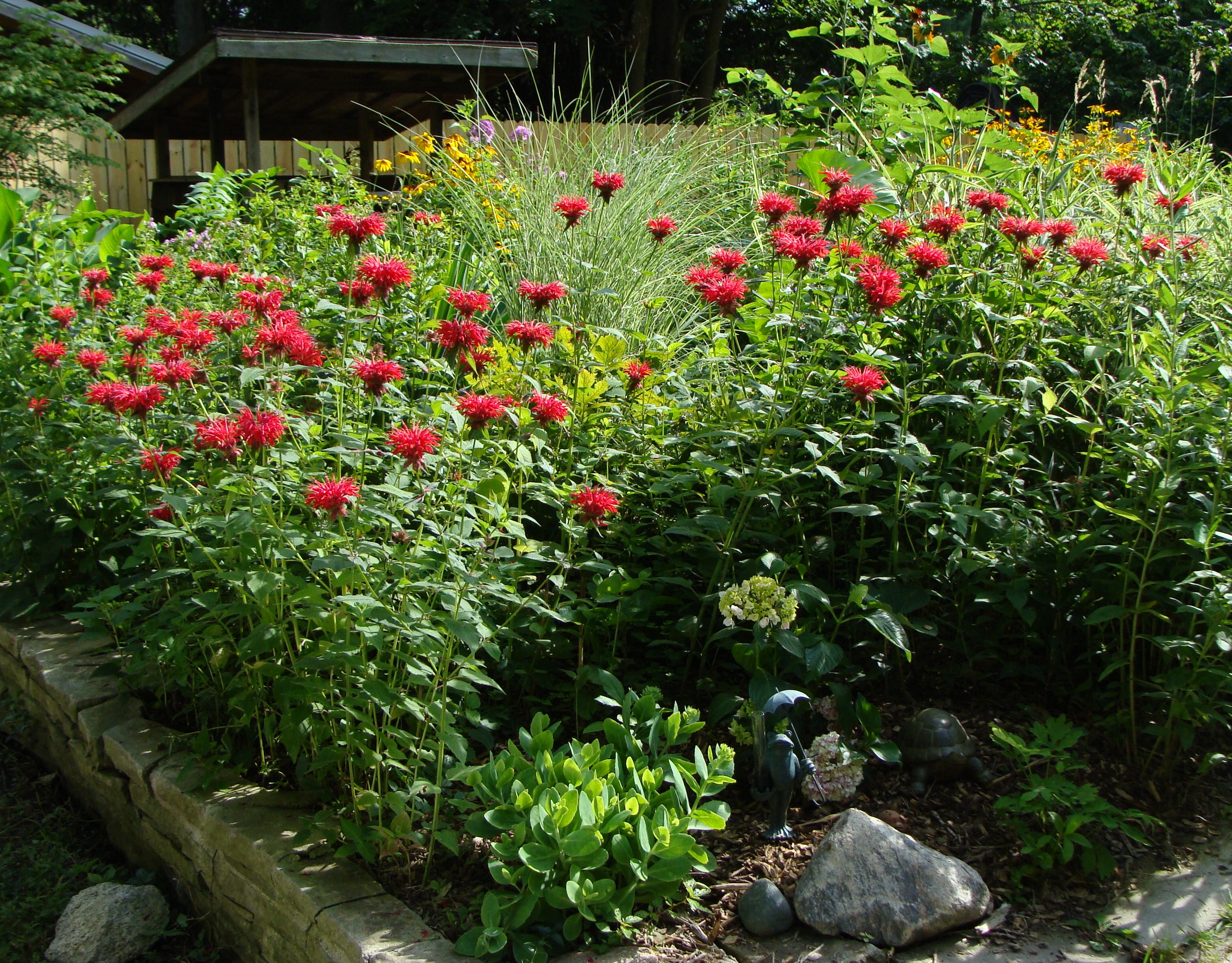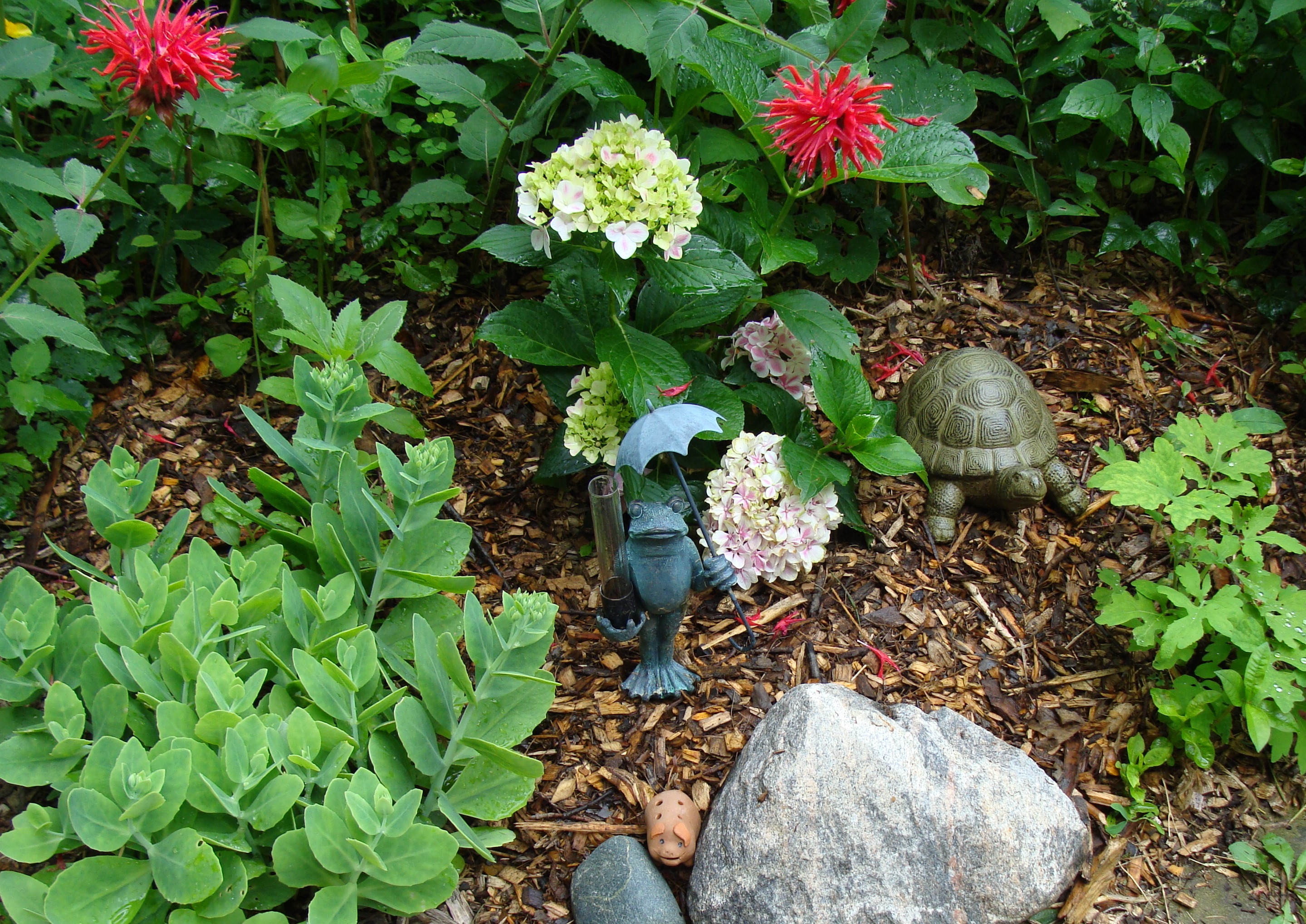 Iron Turtle, Brass Frog and Clay Pig were hanging out below a big patch of bee balm.