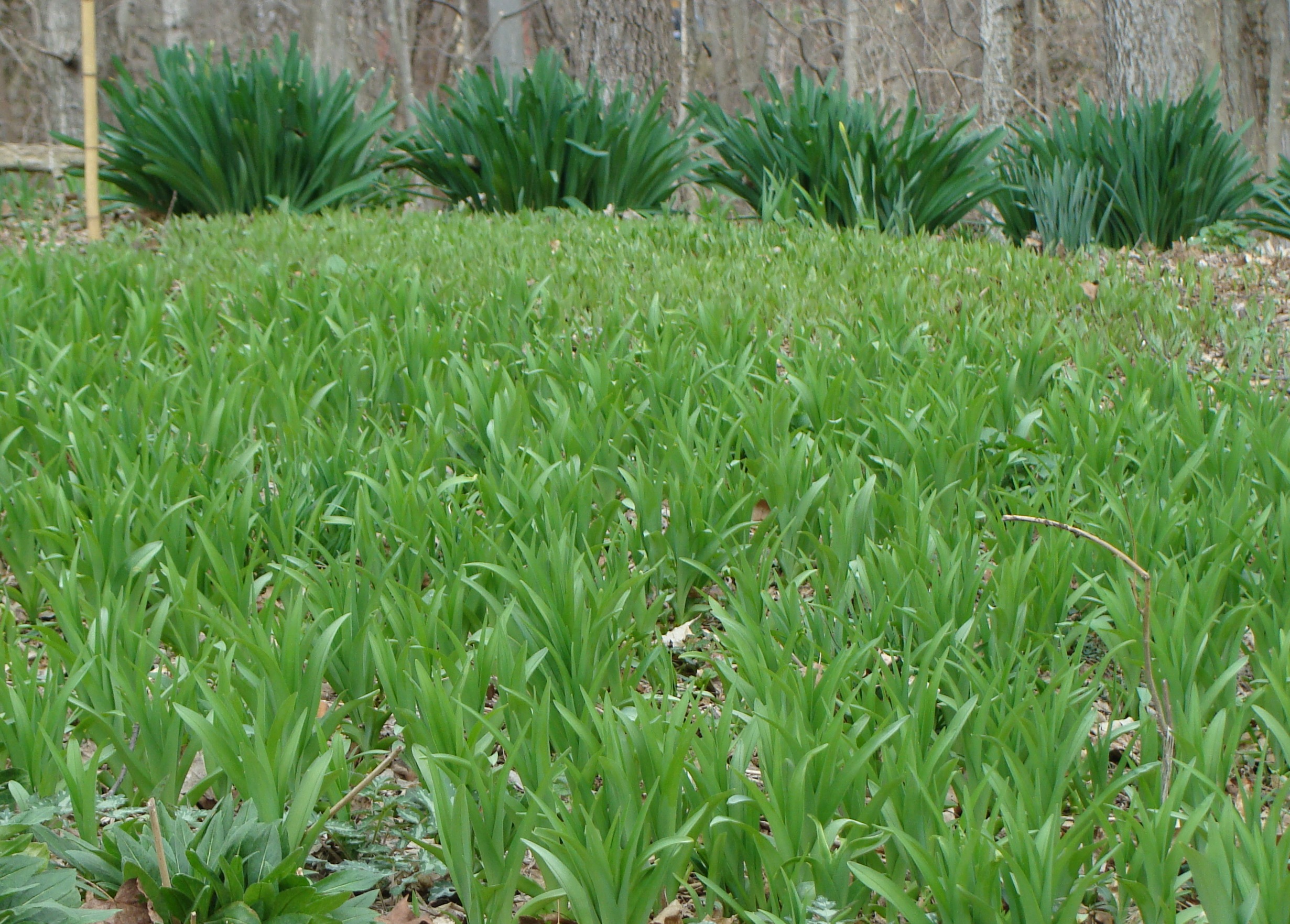 They come up early in the spring in the form of lush green foliage. Here they are back in early April, standing tall over the young shoots of Trout Lillies and Daylillies: