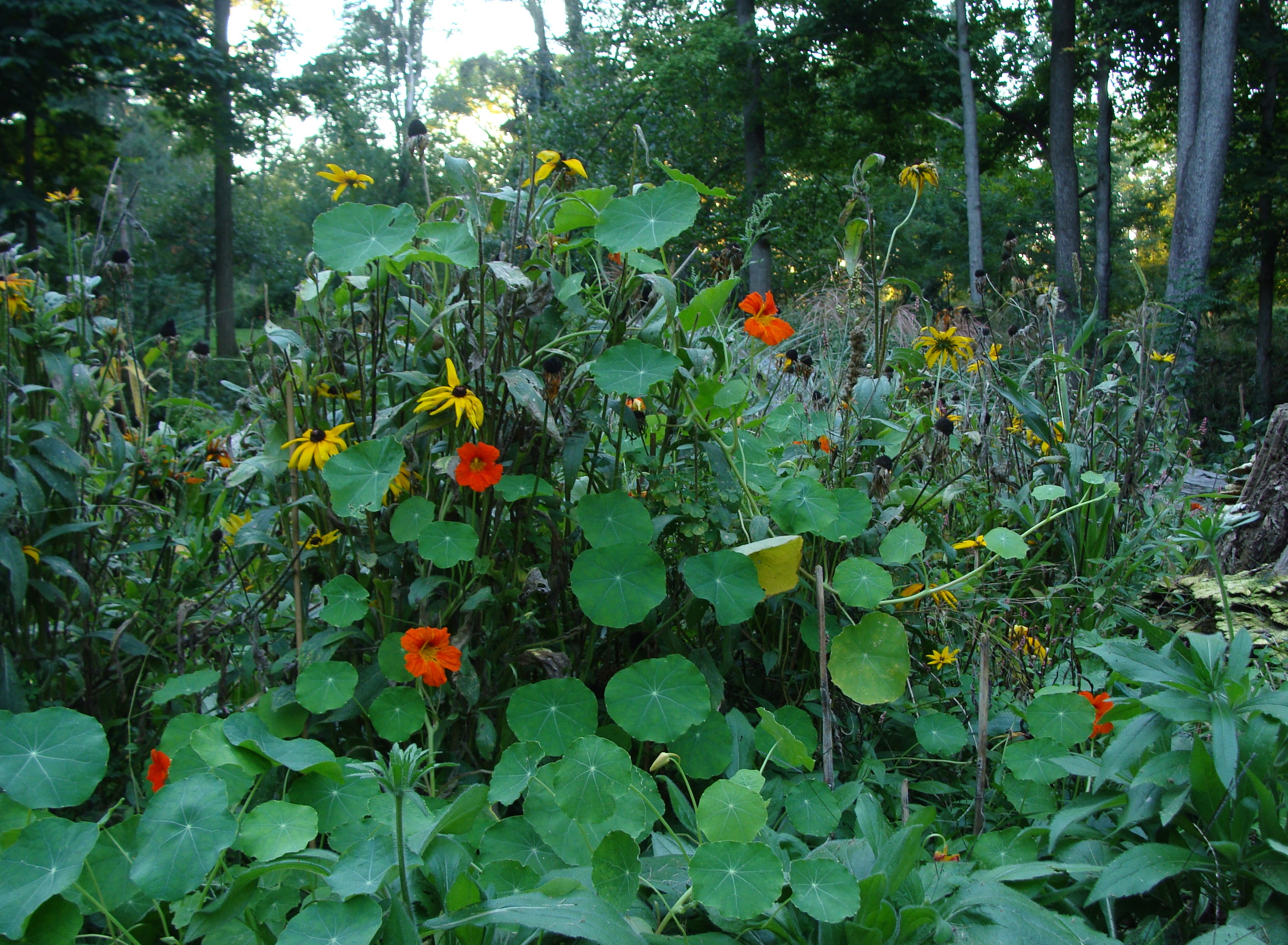 How about this? A photo taken as the sun sets immediately prior to the moment of the technical, geographical equinox. Nasturtium grows wild up over the old stand of Gloriosa Daisy. The symbol of the summer bloom season overwhelmed by a rogue annual growing hell-bent towards the first hard frost.