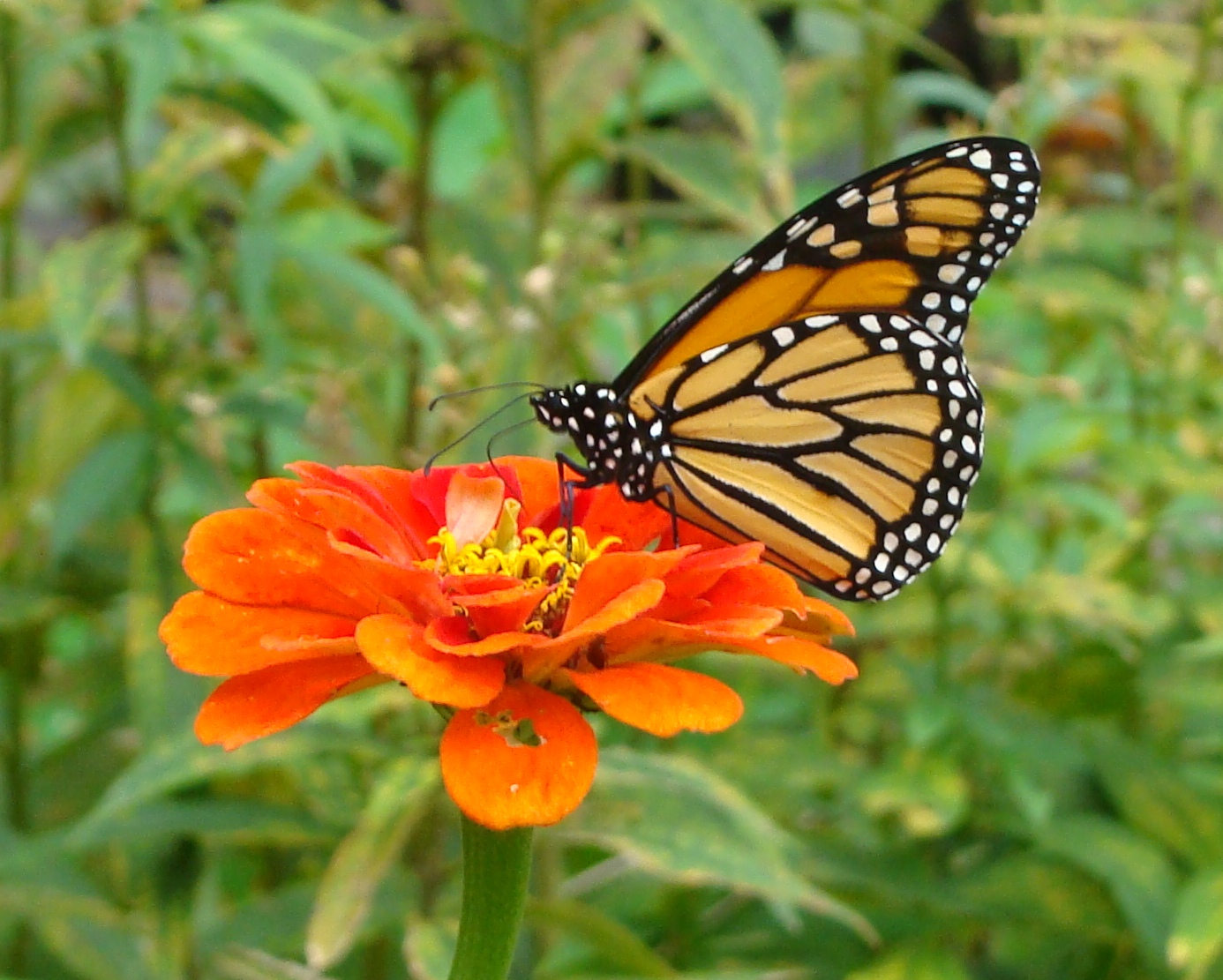 The monarch migration is amazing in so many ways. What really stuns me is not only their internal navigation abilities, but the simple fact that they fly so far. To think of that butterfly travelling thousands of miles in its “flutter-bye” flight pattern. Truly amazing. I say this one is embarking upon its migration, but it is most likely that it is passing through, already in route from further north. I suppose it was glad of my lingering zinnias. And yes, we plan to plant milkweed next year here in this garden. On a property in the country we allow the side-ditches to grow weedy through much of the summer, allowing the monarchs to have their chance with the milkweed.