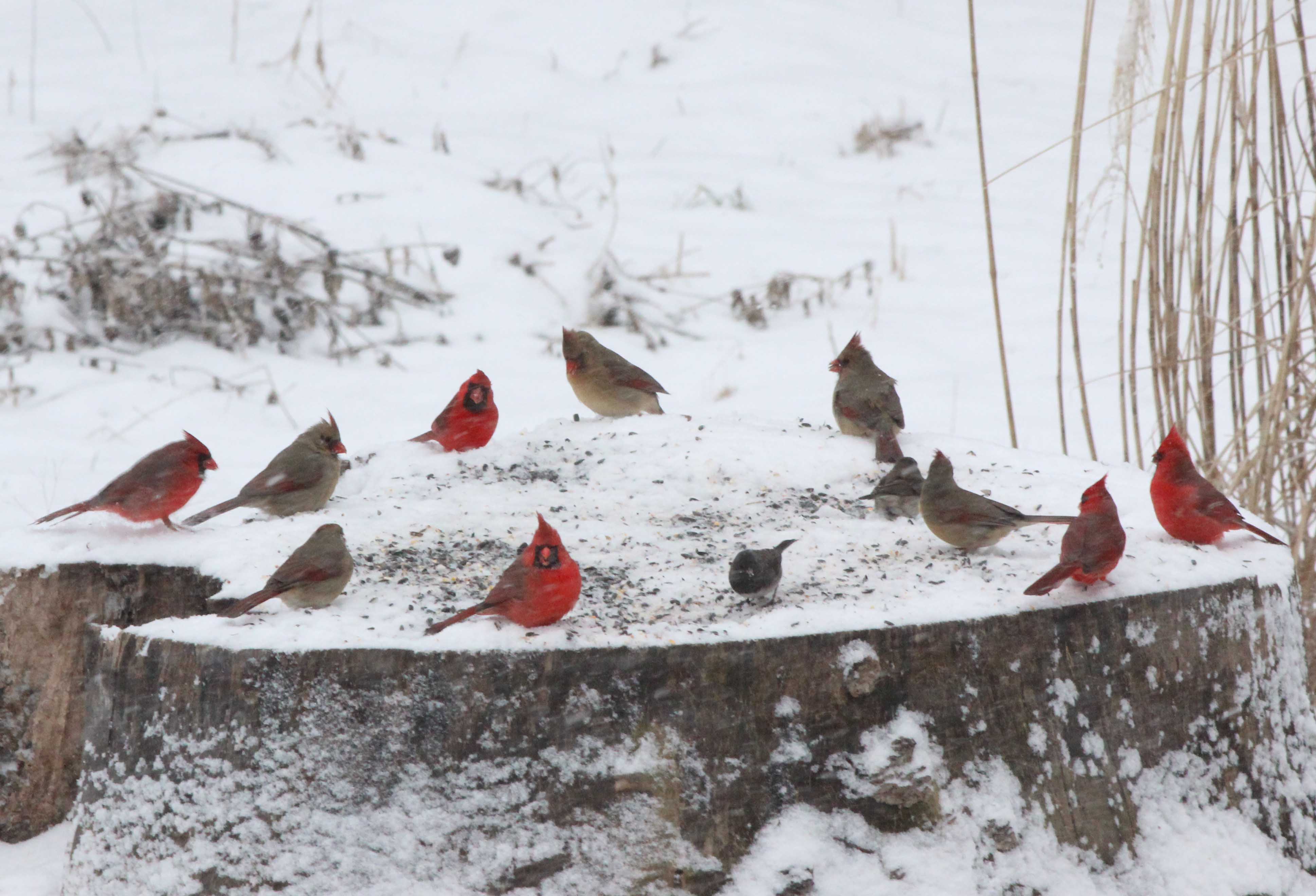 I love your stories and photos! The shot of the cardinals sitting on the stump is incredible. I love how they are almost sitting boy/girl/boy/girl all the way around. I also love the female cardinals and that bright pop of color on their beaks. The males are so bright and flashy but the females have a little color here and there. I loved the titmouse and nuthatch photos, too. Growing up, I used to watch those birds at the feeders, but I just don’t see them where I live now. Do you take requests? How about some blue jays, I miss seeing blue jays 🙂 Just kidding. Great post!