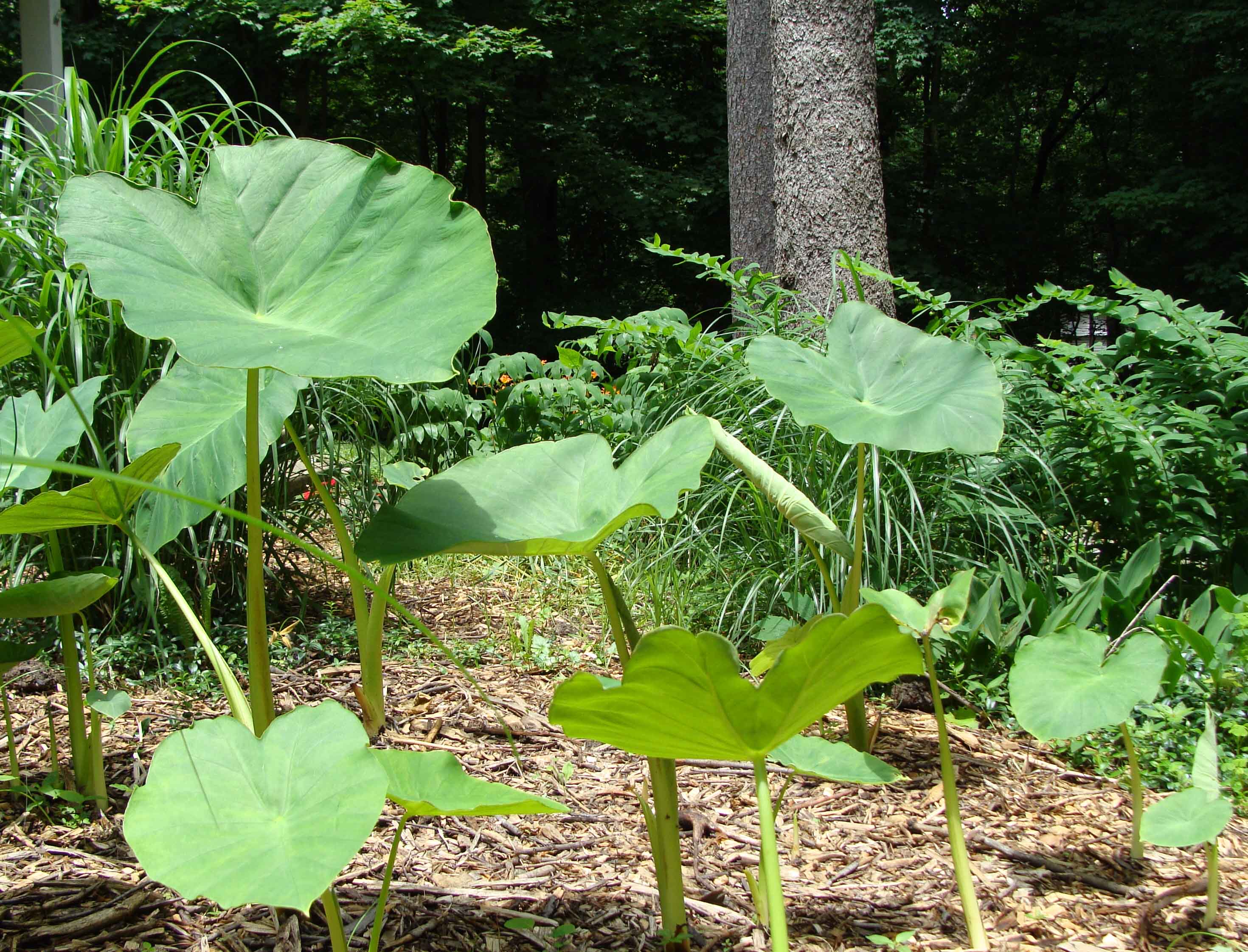 Maintaining a comfortable pace with Elephant Ear are the greenhouse annuals of the Red Impatiens and White Begonias.