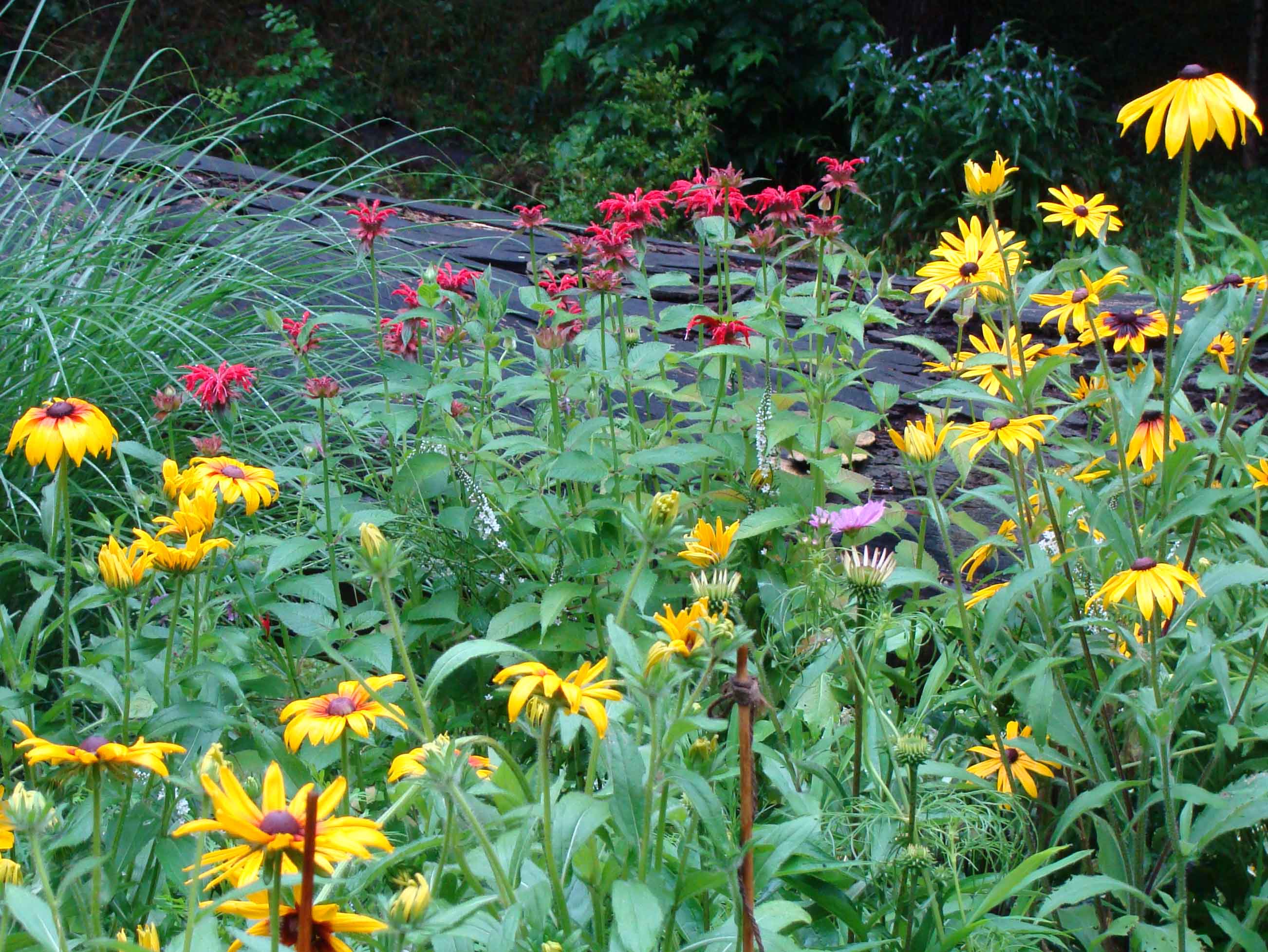 At the end of day three, it appears that the order is Spiderwort, Daylilly, and Bee Balm followed by a determined, yet struggling, Gloriosa Daisy.
